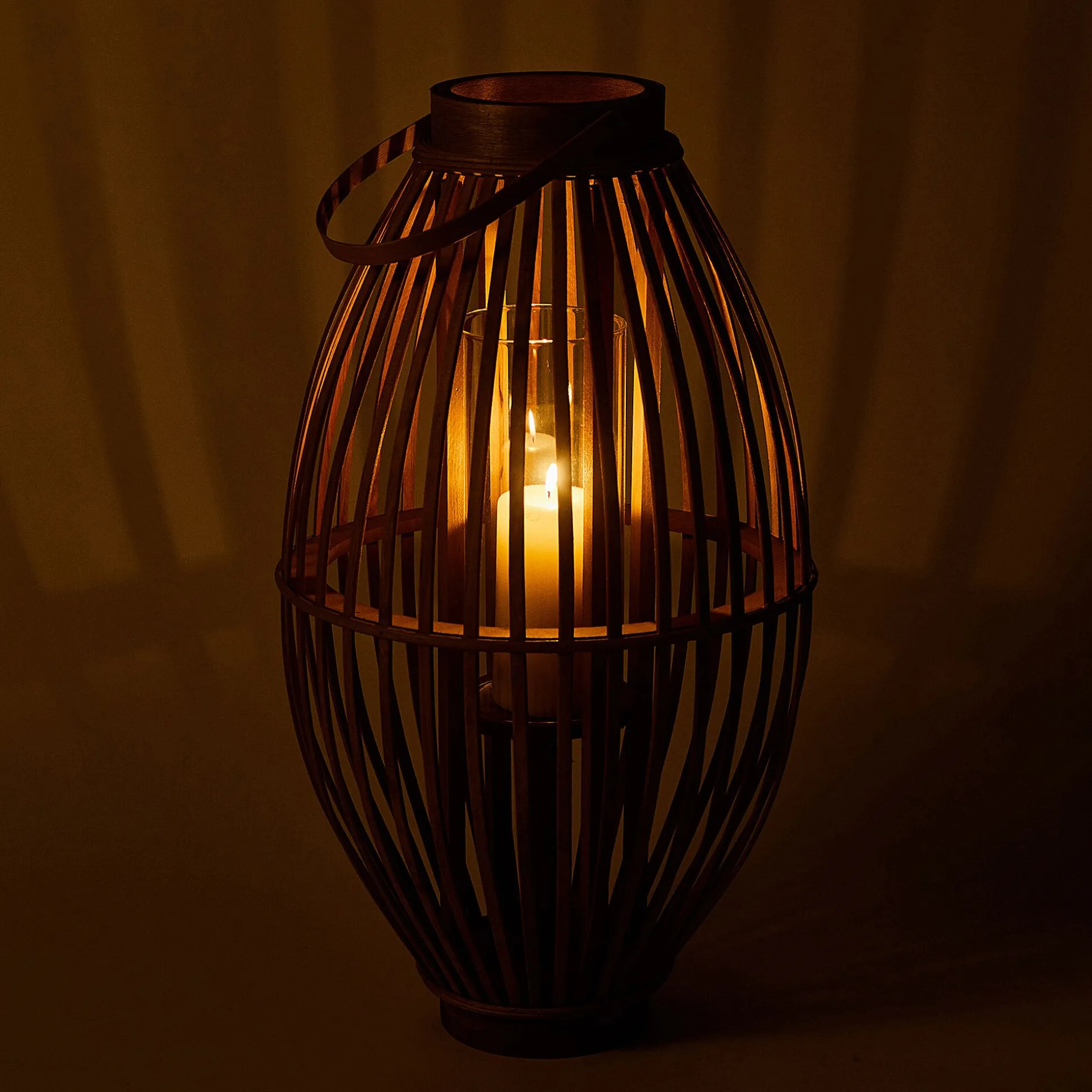 Les longues tiges en rotin enferment en leur coeur un bougeoir cylindrique en verre. Ensemble, ces matériaux nobles forment une lanterne ethnique. Sa couleur naturelle, légèrement dorée, offre un objet déco lumineux. Ce jeu de lumière s’accentue avec les bougies qui brûleront en son centre. La flamme vacille et danse dans sa cage naturelle, beauté exotique qui révèle toute la splendeur à la nuit tombée.
