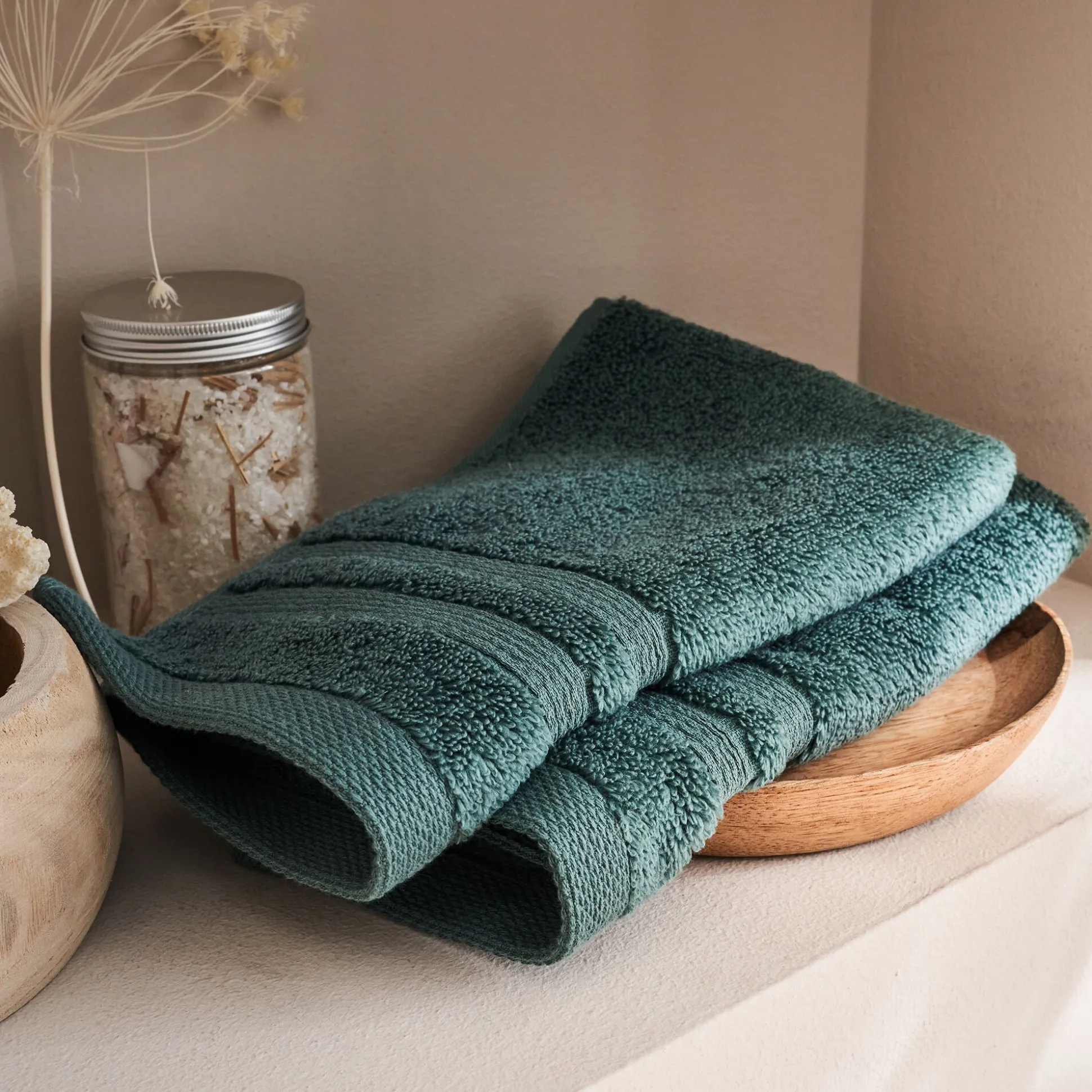 La salle de bains se transforme en un monde de douceur avec la gamme de linge de toilette Noun. Ce linge de toilette de qualité fabriqué au Portugal avec une bouclette en éponge « zéro torsion » résultant d’un tissage très rigoureux. Découvrez ce lot de 2 serviettes invité. Son coloris vert apporte une note de charme à la salle de bains, rappelant des paysages de la méditerranée. Complétez ce linge de toilette avec le reste de la collection de la même couleur qui se compose de gant de toilette, serviette de bain et drap de bain. Cette gamme est disponible dans d’autres couleurs.