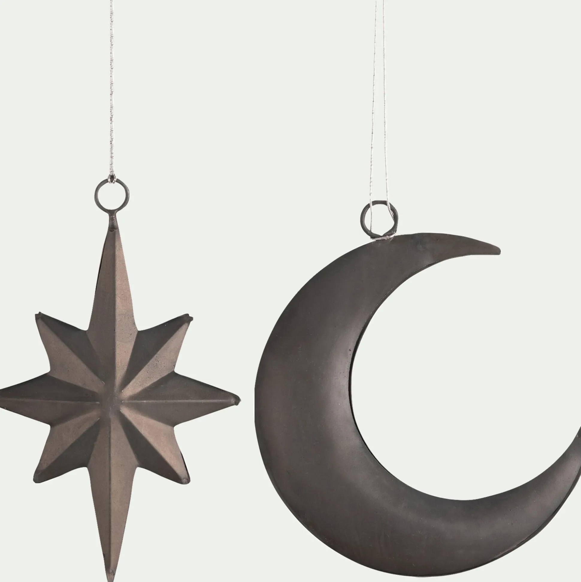 Ce Noël, craquez pour le lot de 2 suspensions Osseja. Cette décoration de Noël se compose d’une étoile à 8 branches et d’un croissant de lune. Cette belle nuit étoilée est confectionnée en fer, un métal argenté qui évoque les mystères du soir. À suspendre dans le sapin, ces décorations apportent une note douce et mystique.
