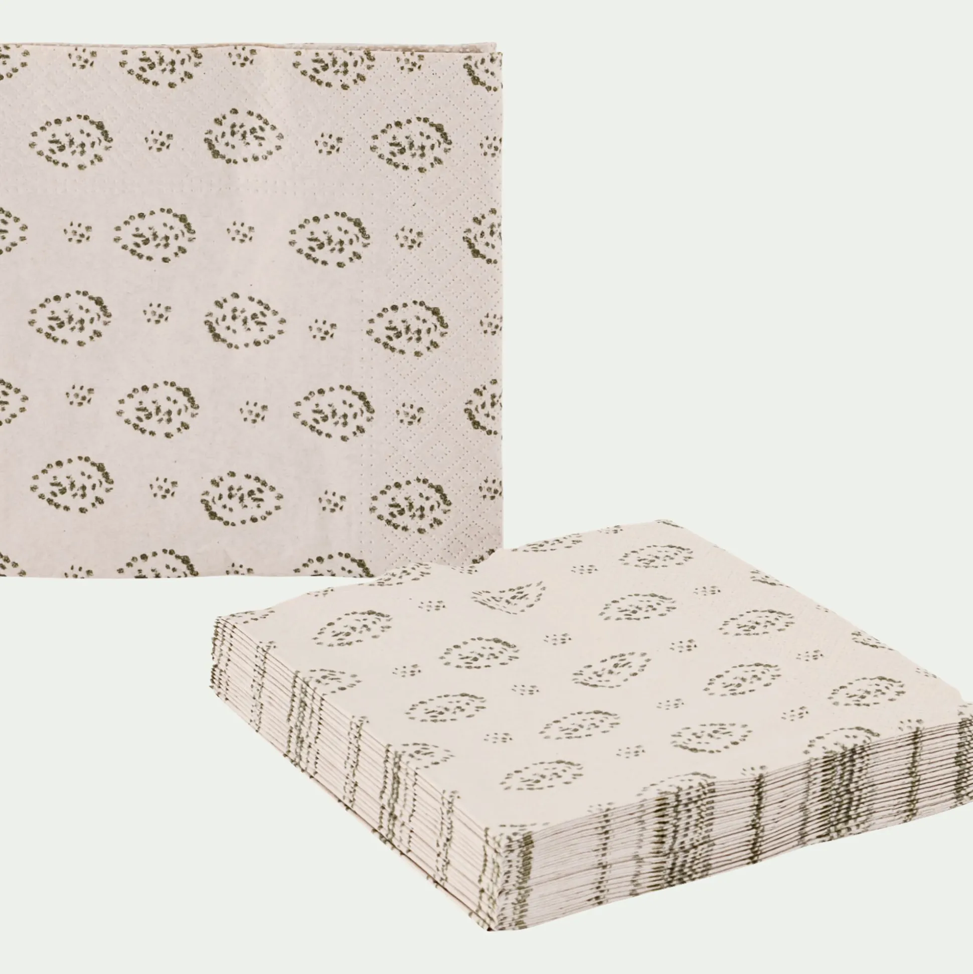 Une teinte neutre de beige, parsemé d’un motif amande tendre vert olivier pour ces serviettes en papier qui apportent une belle touche déco empreinte de délicatesse à vos repas. On dresse une belle table improvisée qui ne fait pas l’impasse sur le style grâce à ces serviettes de table comme touche finale.