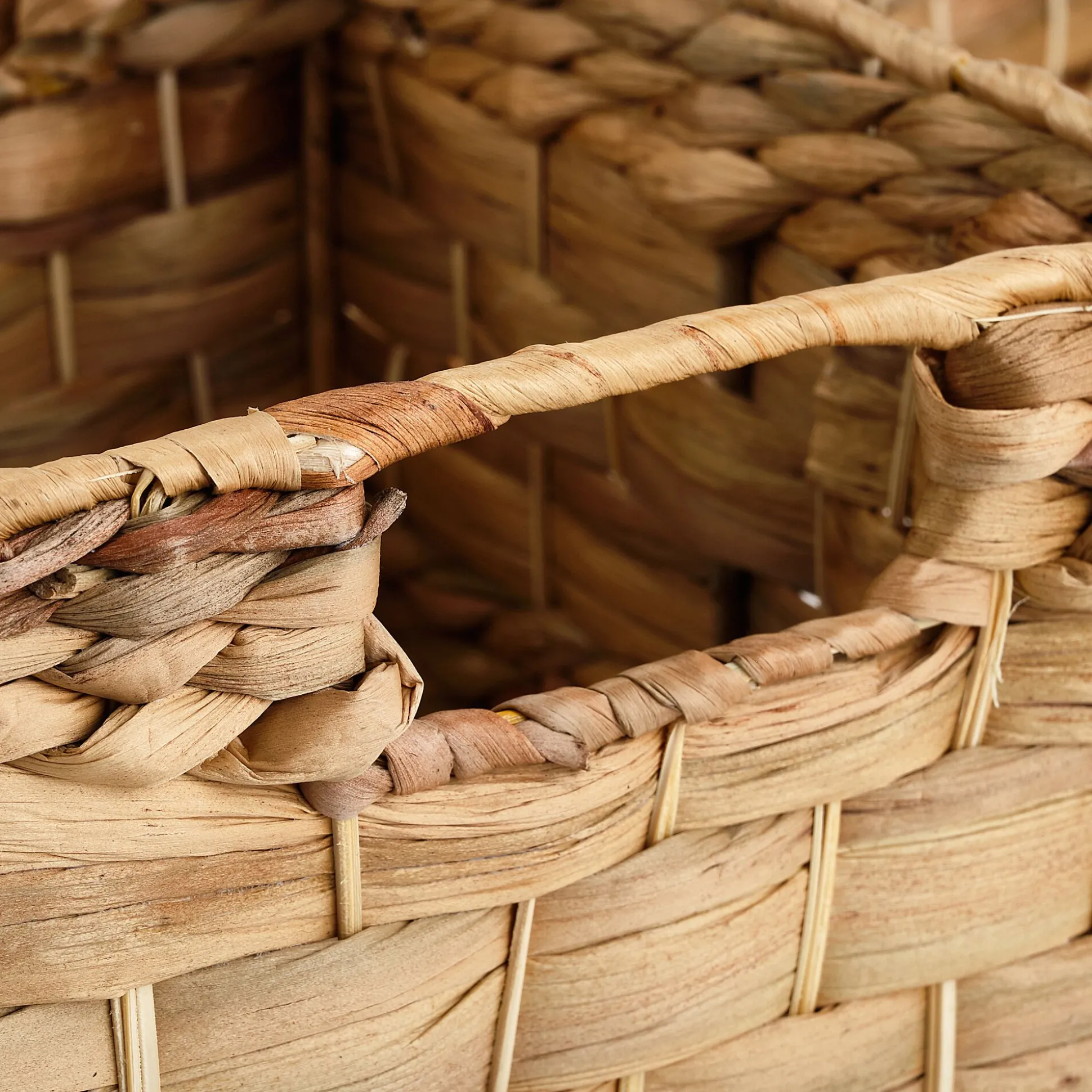 Profitez de ce lot de 3 caisses de rangement en jacinthe d’eau afin de ranger une grande partie de vos affaires. Draps, vêtements, nappes de tables, etc, vous pourrez tout ranger à votre guise. Modulable, vous pouvez vous servir du grand panier avec couvercle comme d’un abris anti-poussière pour vos autres paniers. Avec leur bande plaquée effet tressage sur le pourtour des paniers et leur petit tressage, ils donnent un effet naturel à votre pièce.