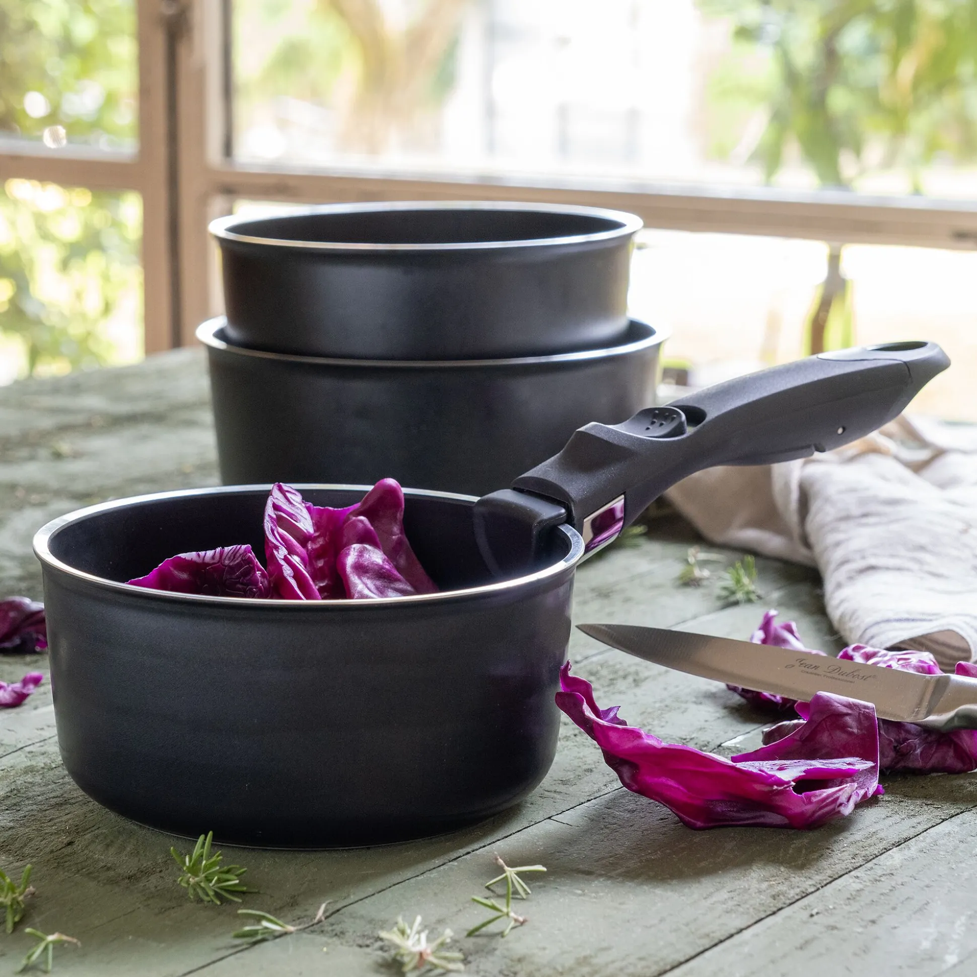 Découvrez ce set de 3 casseroles fourni avec une poignée amovible en bakélite et insert silicone. Cela vous permet de passer d’un ustensile à l’autre, de la plaque au four en toute simplicité et sécurité. Vous pouvez aussi empiler les casseroles et y mettre le manche, afin de bénéficier d’un rangement optimal. Le corps des casseroles est en aluminium avec un fond en acier inoxydable pour une répartition optimum de la chaleur. Avec une épaisseur de 2.5mm et un revêtement anti-adhésif haute résistance, cette gamme mobile est tous feux dont induction. Ce sont des ustensiles de cuisine pratiques qui conviendront parfaitement pour préparer de savoureux repas au quotidien. Retrouvez dans la même collection un set de poêles pour venir compléter cette batterie.