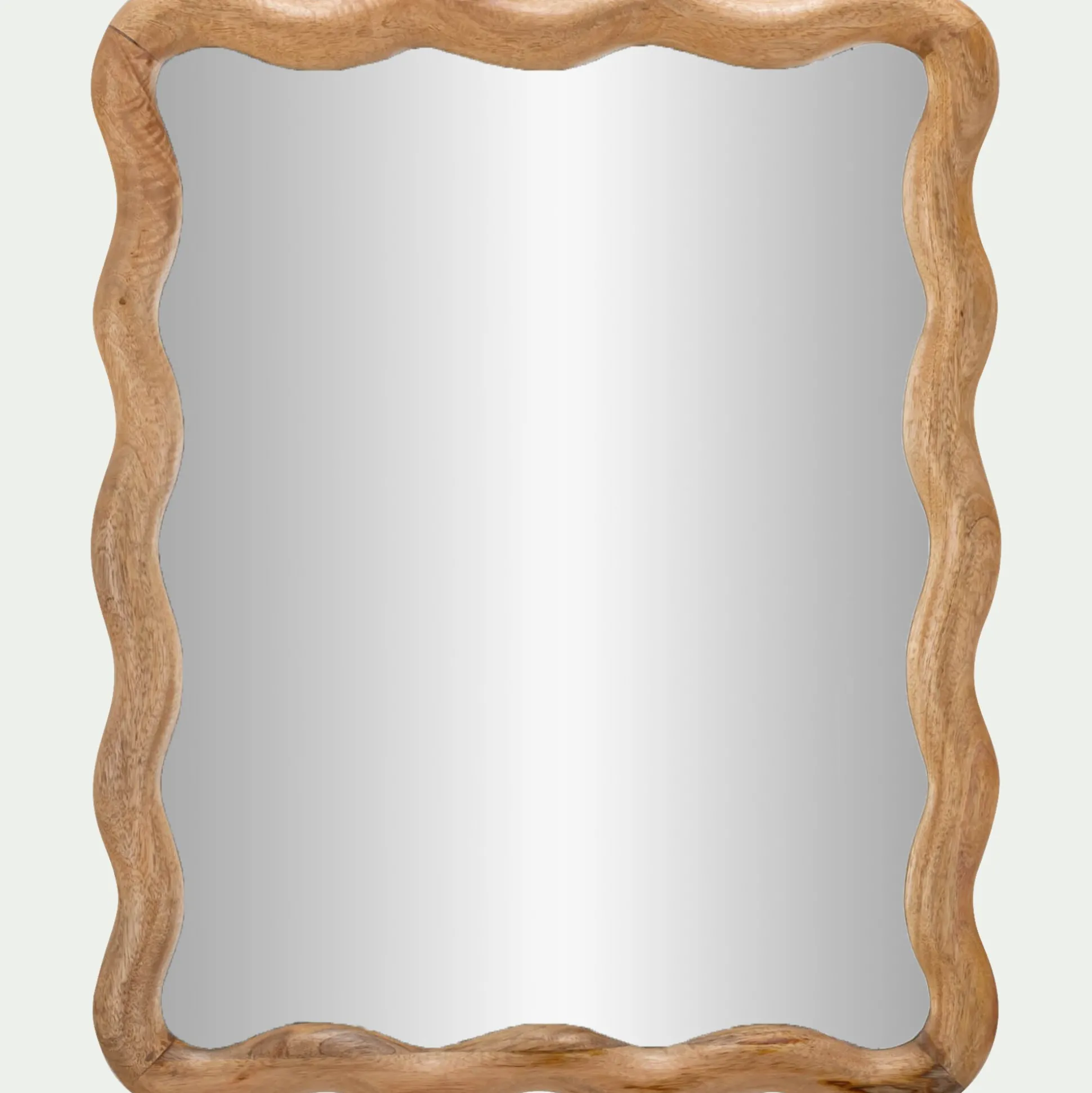 Le miroir mural Alana attire immédiatement le regard avec son encadrement ondulé en bois de manguier. Sa forme fantaisie lui confère une allure singulière et décorative, idéale pour habiller un mur avec originalité. De 51×63 cm, il se suspend facilement et devient une pièce maîtresse naturelle dans la déco intérieure.