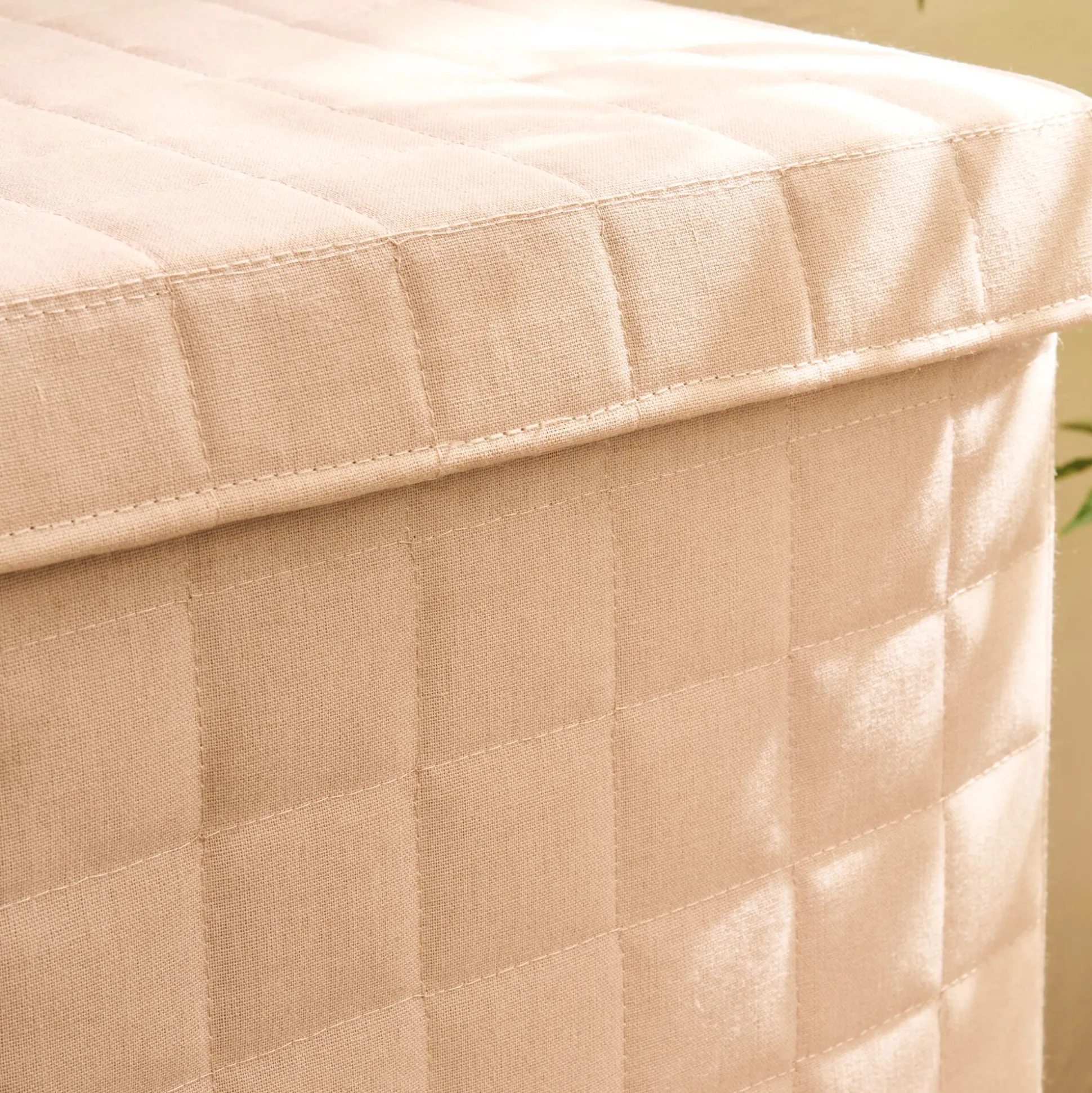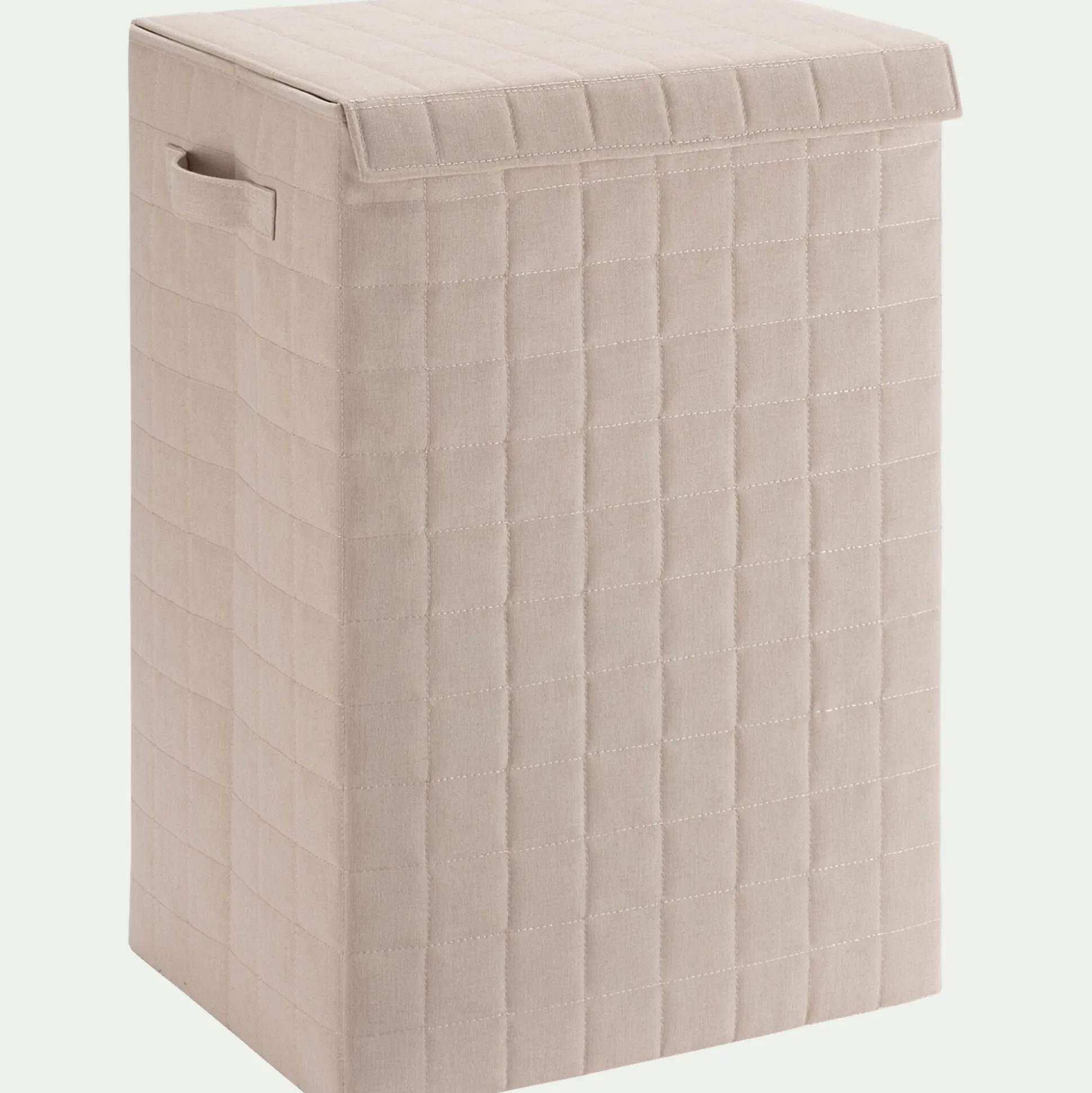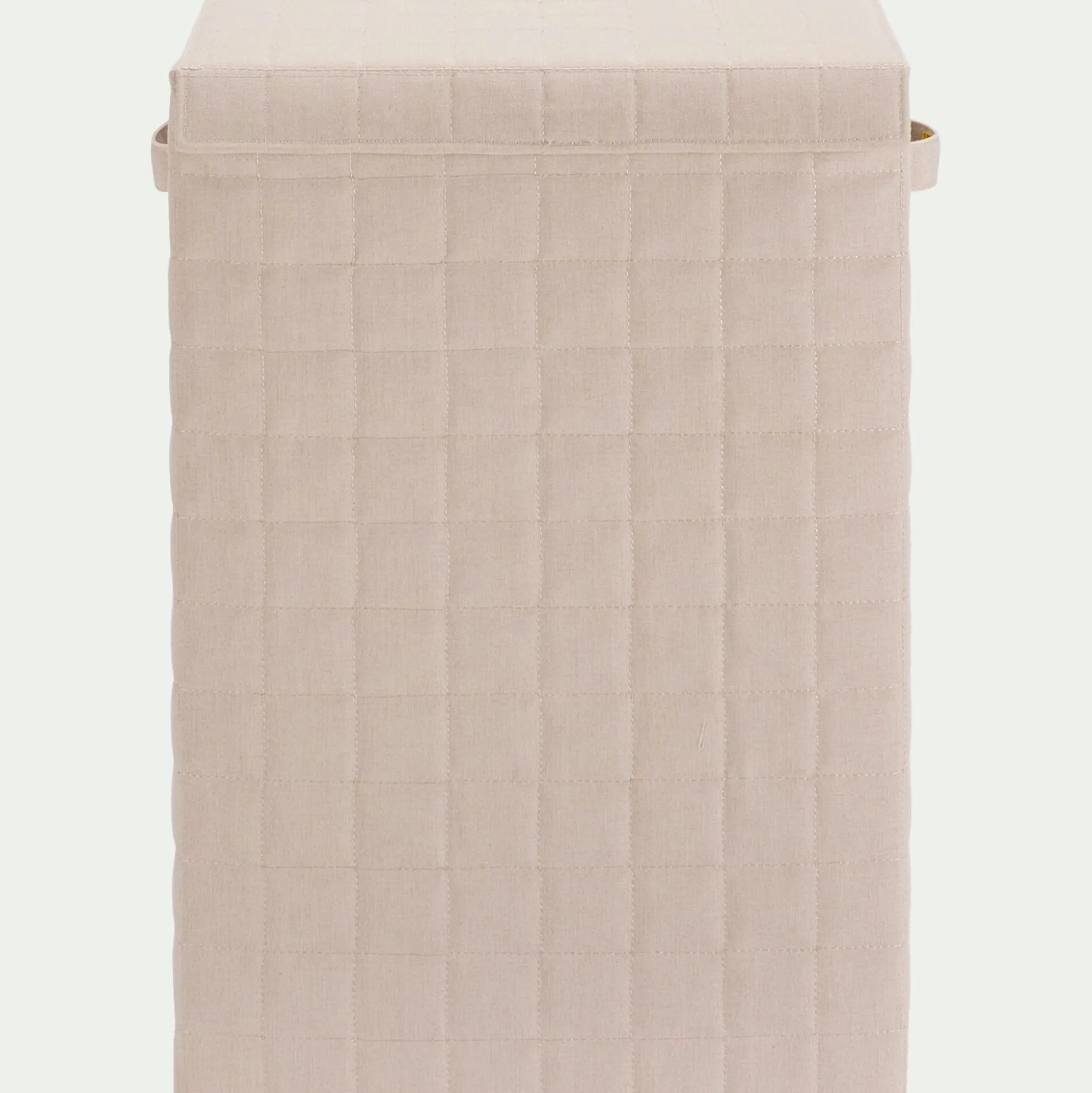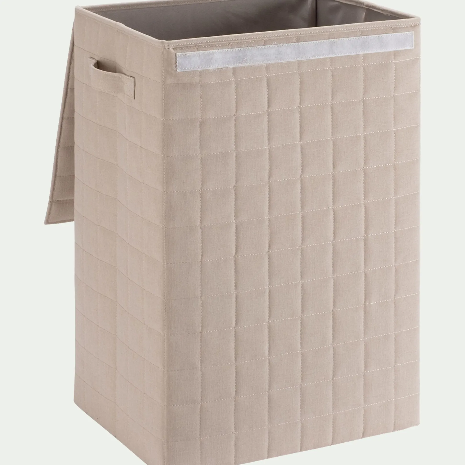 Ce panier à linge en tissu beige allie praticité et douceur visuelle. Son effet matelassé, souligné par des coutures blanches, lui confère un style cosy et chaleureux. Idéal pour ranger au quotidien, il accueille votre linge, tout en se fondant élégamment dans la déco. Doté d’un couvercle à fermeture velcro et de deux poignées latérales, il se déplace facilement d’une pièce à l’autre. Un indispensable aussi esthétique que fonctionnel.