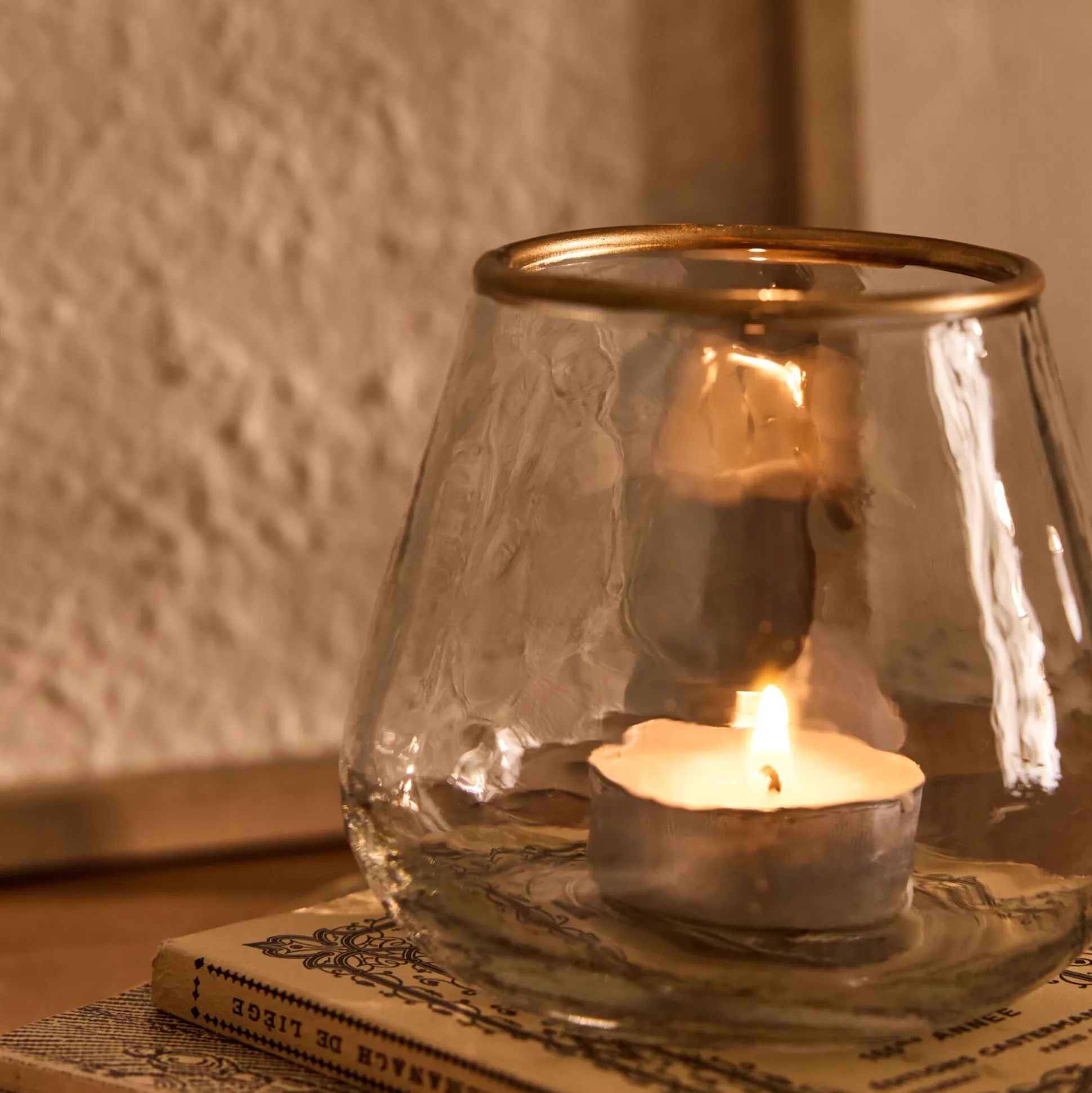 Épuré et élégant, le photophore Tiros se distingue par sa simplicité. En verre transparent, il laisse entrevoir la bougie en son cœur. La lueur de la flamme est parfaitement mise en valeur et éclaire généreusement l’espace. Un fin liseré doré vient souligner la bordure de ce petit photophore et lui apporter un éclat festif, parfait pour une grande occasion.