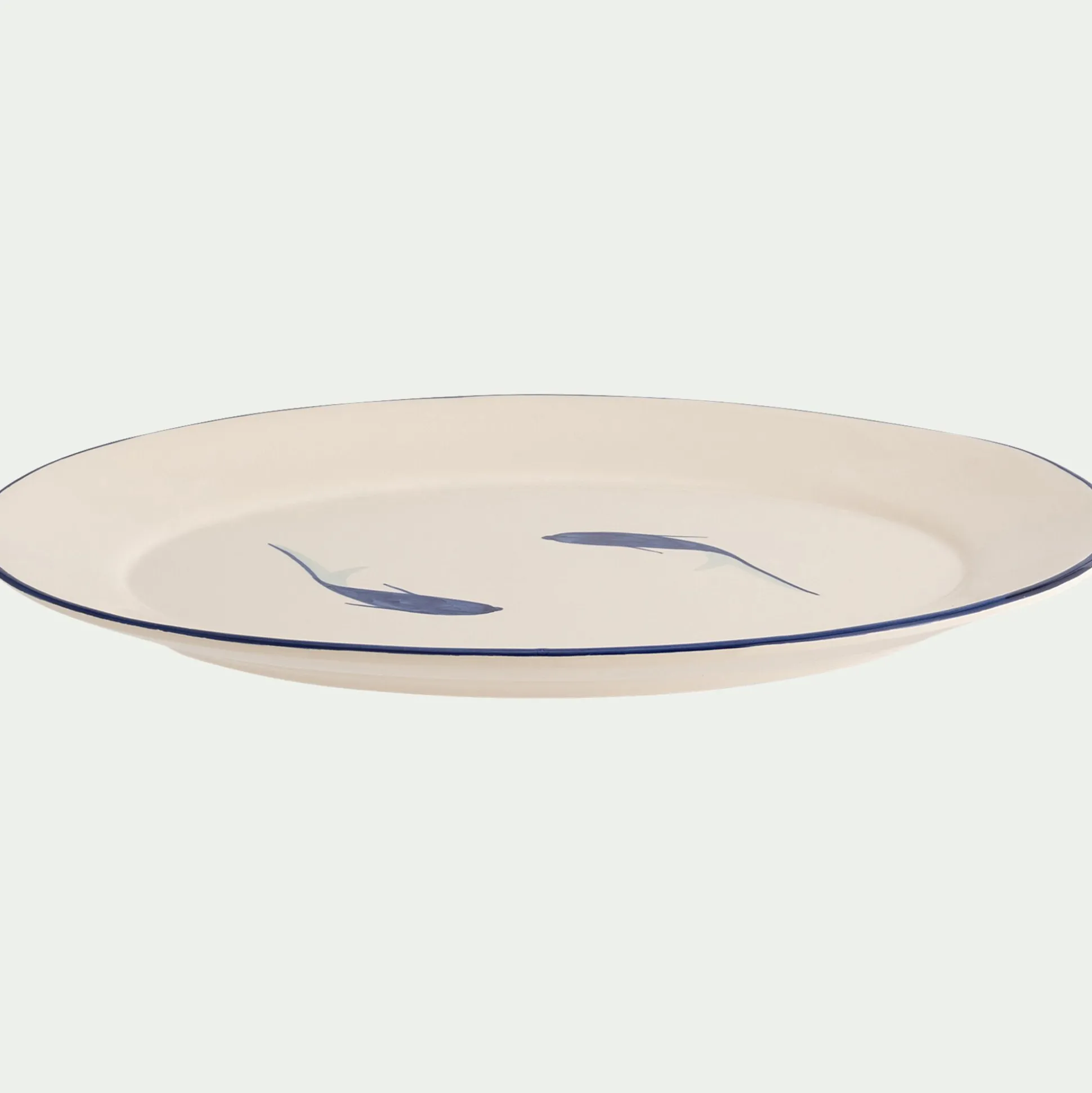 Le plat de présentation Anchova séduit par son design à la fois sobre et poétique. Confectionné en faïence blanche, il arbore un motif bleu où deux petits poissons semblent nager avec élégance. Son format ovale en fait une pièce polyvalente, idéale pour servir un rôti, des fromages ou d’autres mets à partager. Un plat ovale qui invite à des repas conviviaux avec une touche de fraîcheur.