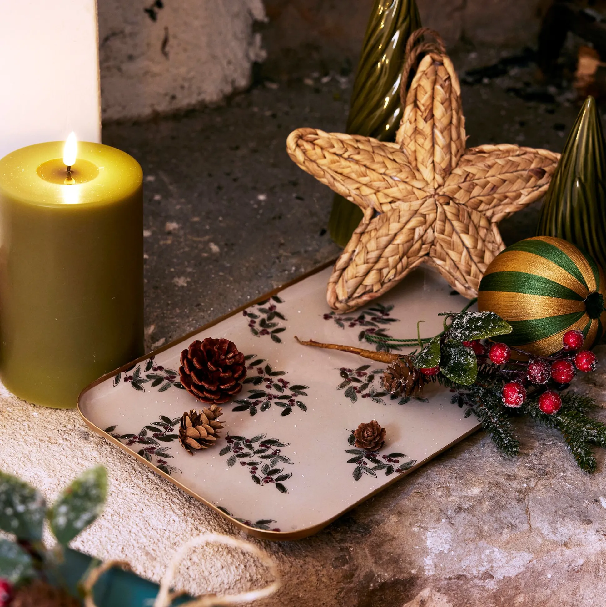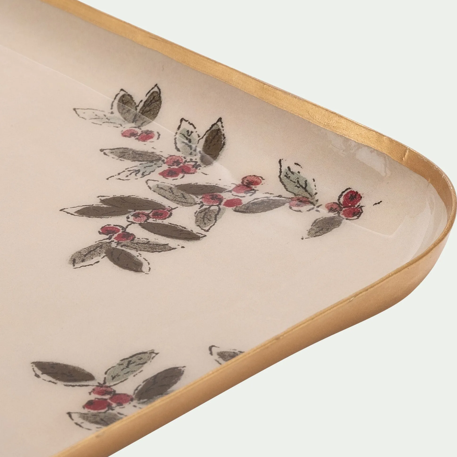 Ce plateau décoratif en fer apporte une touche d’élégance à votre intérieur. Avec ses angles arrondis, il allie douceur et raffinement. Habillé de blanc, il met en valeur le motif Fragon, un arbrisseau évoquant le houx avec ses feuilles vertes et ses baies rouges. Un délicat liseré doré souligne l’ensemble, ajoutant une note festive et brillante.