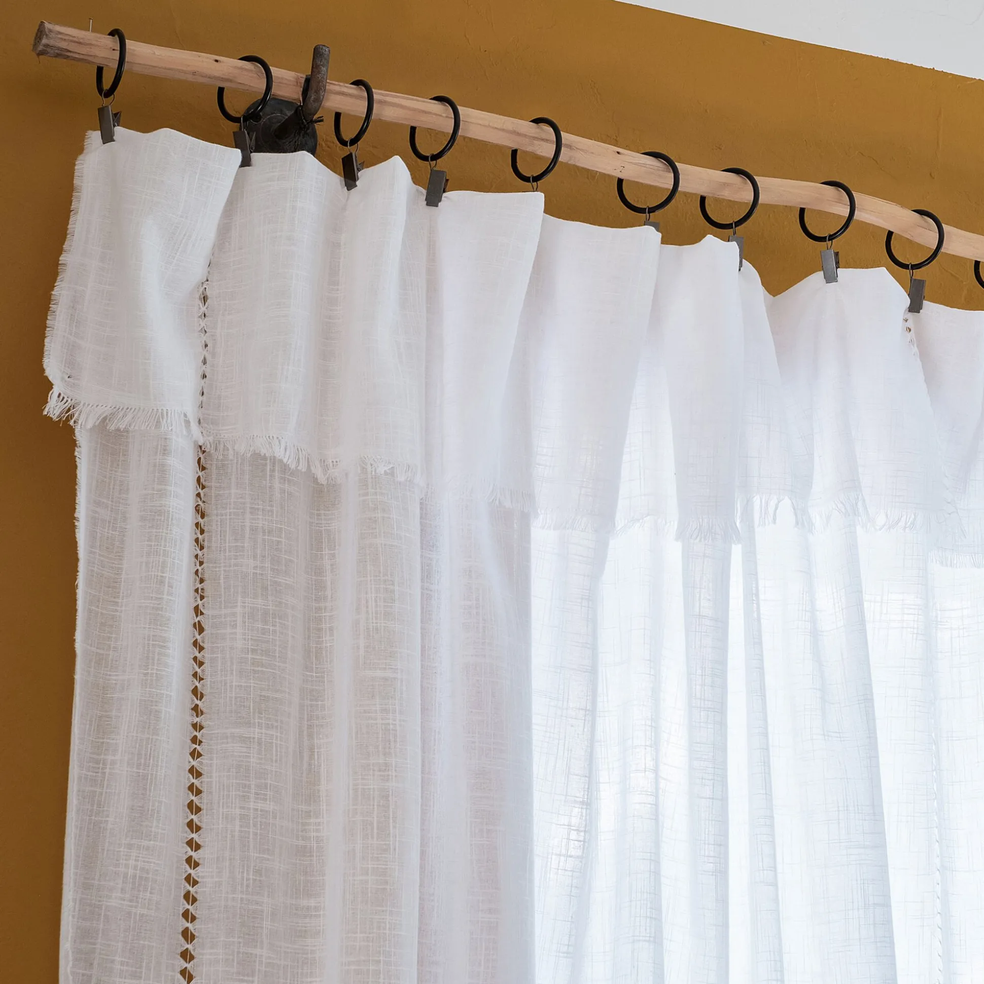 Tamisez votre pièce tout en la décorant grâce à ce rideau blanc. Ce rideau de 140×280 cm recouvrira toute la superficie de vos fenêtres afin d’obscurcir légèrement votre intérieur en filtrant les rayons du soleil. Avec son joli tissu en coton à la finition ajourée et avec des petites franges, il vous permettra également de décorer votre maison en y ajoutant des détails subtils. Accrochez-le à une jolie tringle grâce à un système d’attaches à anneaux pinces Brenon et créez une décoration délicate et élégante.