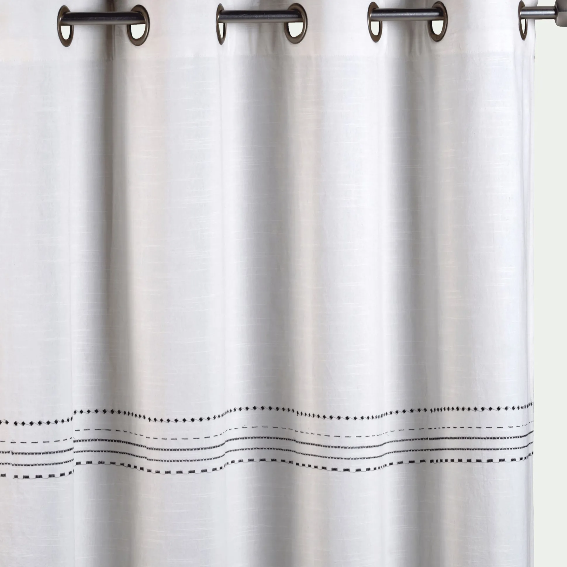 Medine est un rideau très élégant qui joue sur un léger contraste entre le noir et le blanc. Très lumineux, puisque majoritairement blanc, ce rideau doit son originalité à une succession de points de broderie divers. Ses oeillets lui permettent de coulisser facilement sur la tringle pour tamiser la pièce en mouvement. Plein de charme, ce rideau habille avec grâce l’espace et s’associe avec bon nombre de décorations.
