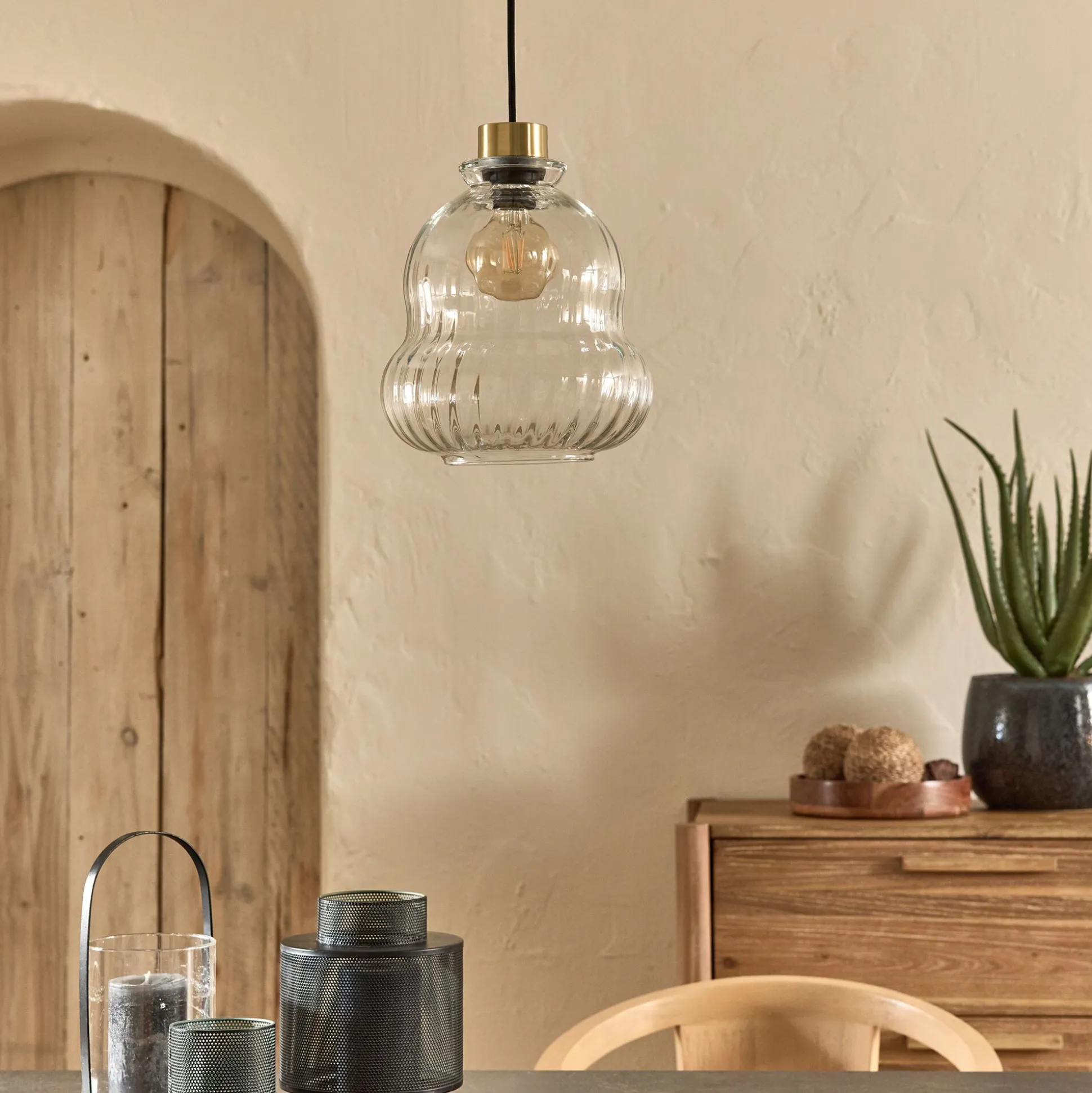Cette suspension en verre transparent se distingue par sa forme organique aux courbes douces, qui évoquent la fluidité et l’élégance. L’abat-jour laisse généreusement filtrer la lumière, créant un éclairage clair et homogène, idéal pour un espace nécessitant un bon confort visuel, tel qu’un bureau ou une bibliothèque. Les finitions en laiton ajoutent une subtile touche dorée, rehaussant l’ensemble d’un éclat raffiné. Cette suspension électrifiée est à la fois moderne et intemporelle.