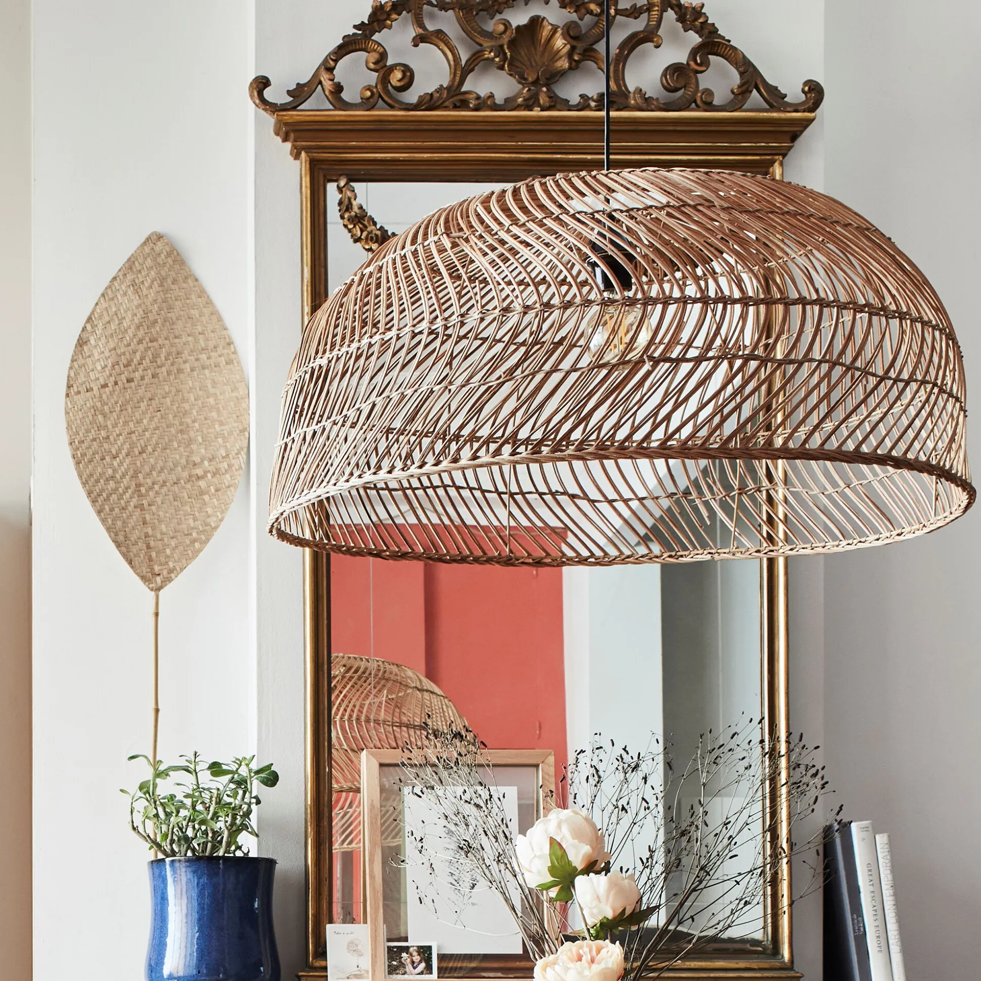 Mirna est une suspension naturelle, tressée à partir de fibres de rotin. Matériau souple, le rotin donne du mouvement à votre intérieur. Les fibres naturelles ondulent et donnent vie à un luminaire dynamique. A mi-chemin entre tradition et modernité, cette suspension en rotin insuffle chez vous un air de vacances. Son design bohème apaise votre intérieur. Particulièrement ajouré, ce luminaire en rotin laisse librement se diffuser la lumière. Cette grande suspension de 80 cm de diamètre est vendue sans système électrique ni ampoule.