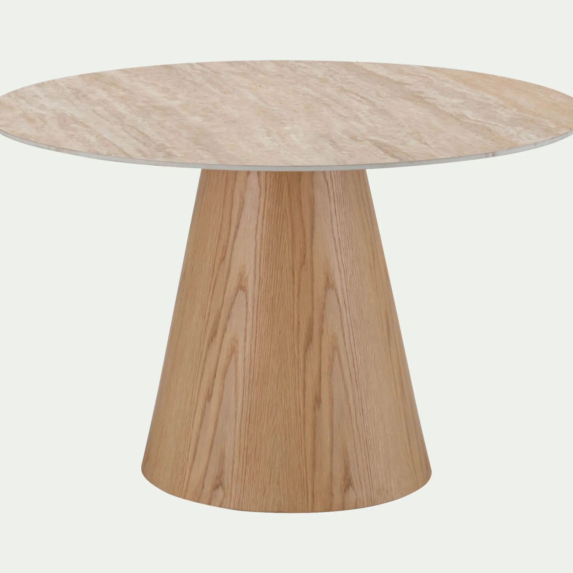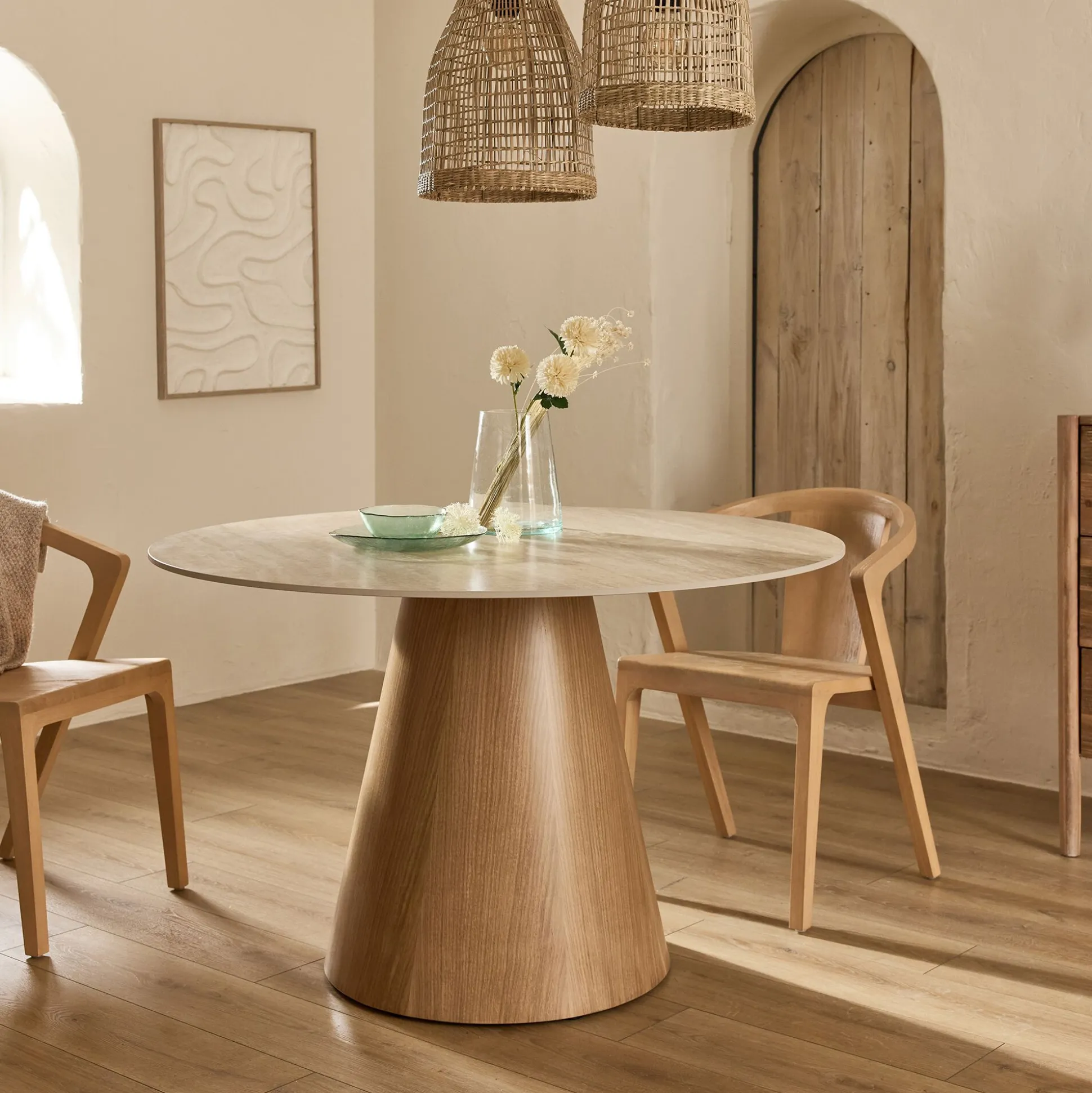 La table de repas Castellane séduit par l’élégance de ses matières et la douceur de ses lignes. Son plateau rond en céramique repose sur un piètement en bois, une alliance raffinée qui apporte du caractère à la salle à manger. Avec ses 120 cm de diamètre, elle accueille confortablement entre 4 et 6 personnes tout en laissant une bonne circulation autour. Une table conviviale au style contemporain, pensée pour embellir le quotidien.
