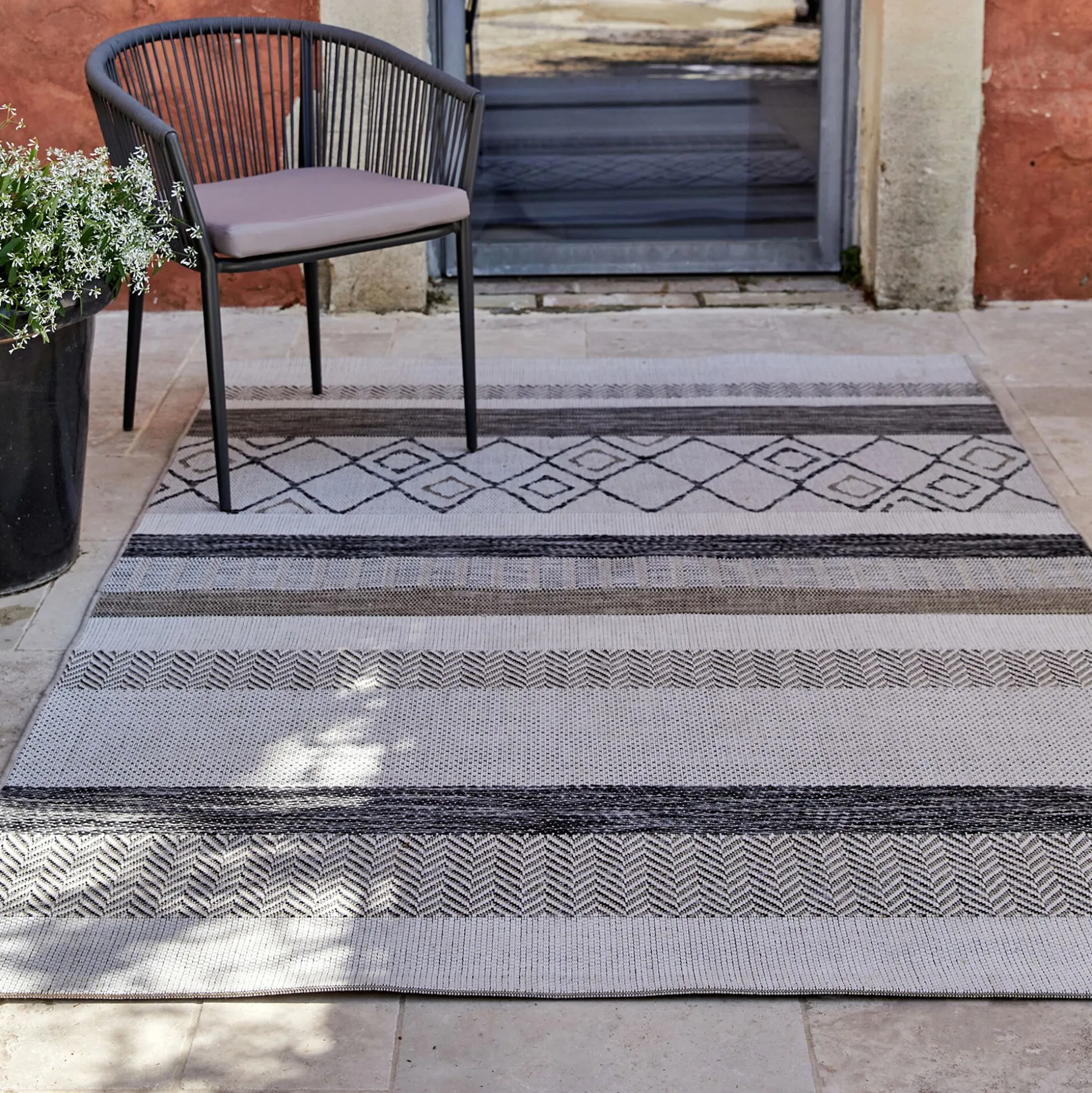 Ce joli petit tapis en 120x170cm composé de bandes alternant chevrons et motifs ethniques donnera du cachet à votre intérieur ou votre extérieur. Ce tapis, décliné dans un camaïeu de gris et de marron chiné, est bel élément déco, qui embellira votre terrasse, l’entrée de la maison, ou même la chambre comme descente de lit. Il convient aussi très bien en tapis de couloir.