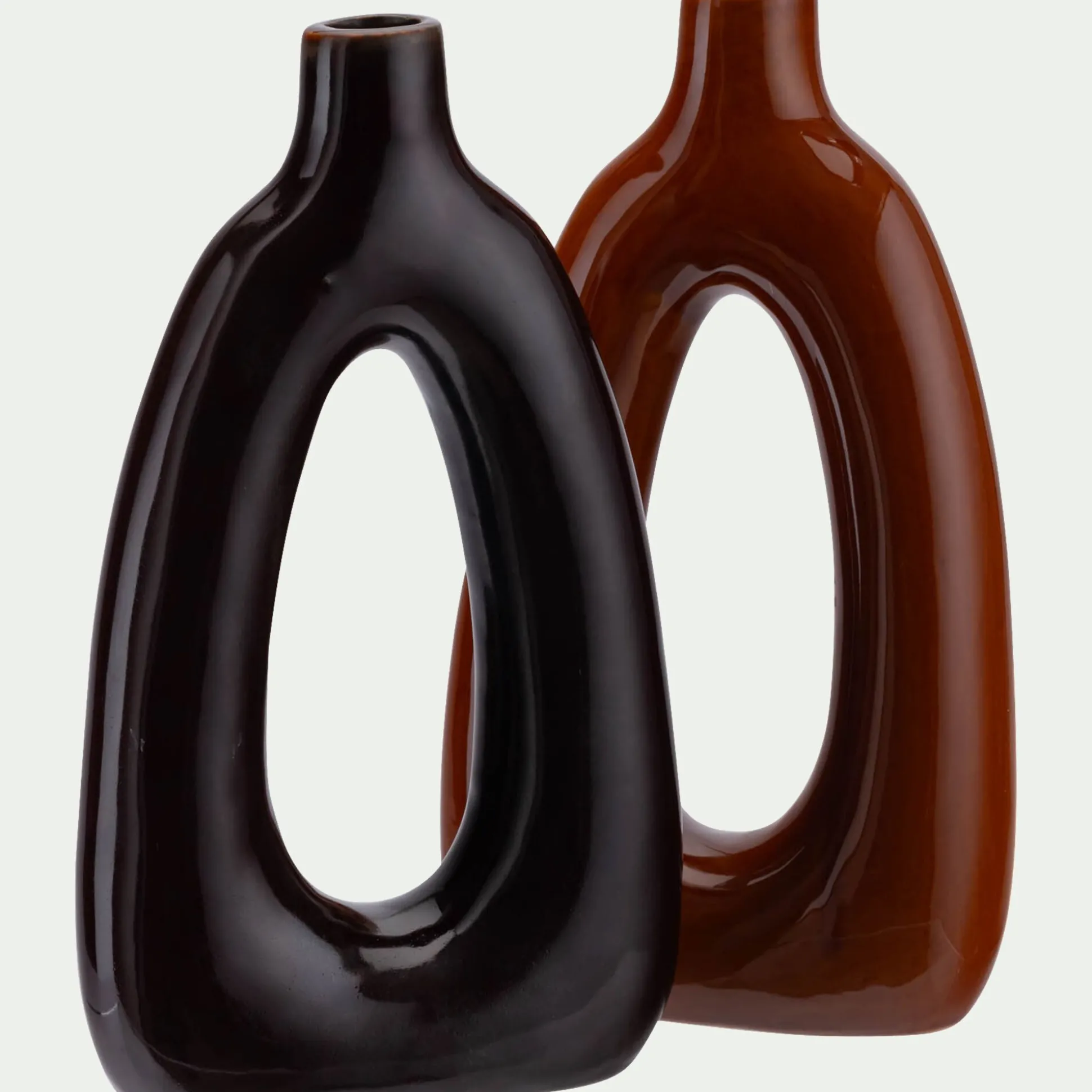 Découvrez cet assorti de vases en céramique marron émaillée qui dévoile une silhouette singulière, véritablement sculpturale et qui attire le regard. Leur forme organique et le passage ajouré au centre apportent une touche de modernité subtile à votre décoration. La richesse du coloris marron glacé, brillant et profond, réchauffe l’atmosphère de la pièce. Pièce de déco à part entière, ils sublimeront un buffet ou une étagère en toute simplicité. Conçus en porcelaine, ces vases assurent une belle robustesse pour accueillir vos plus beaux bouquets de fleurs séchées, ou être exposé comme un objet d’art contemporain. Il s’associe élégamment à des teintes naturelles et des matières minérales pour une ambiance très actuelle.