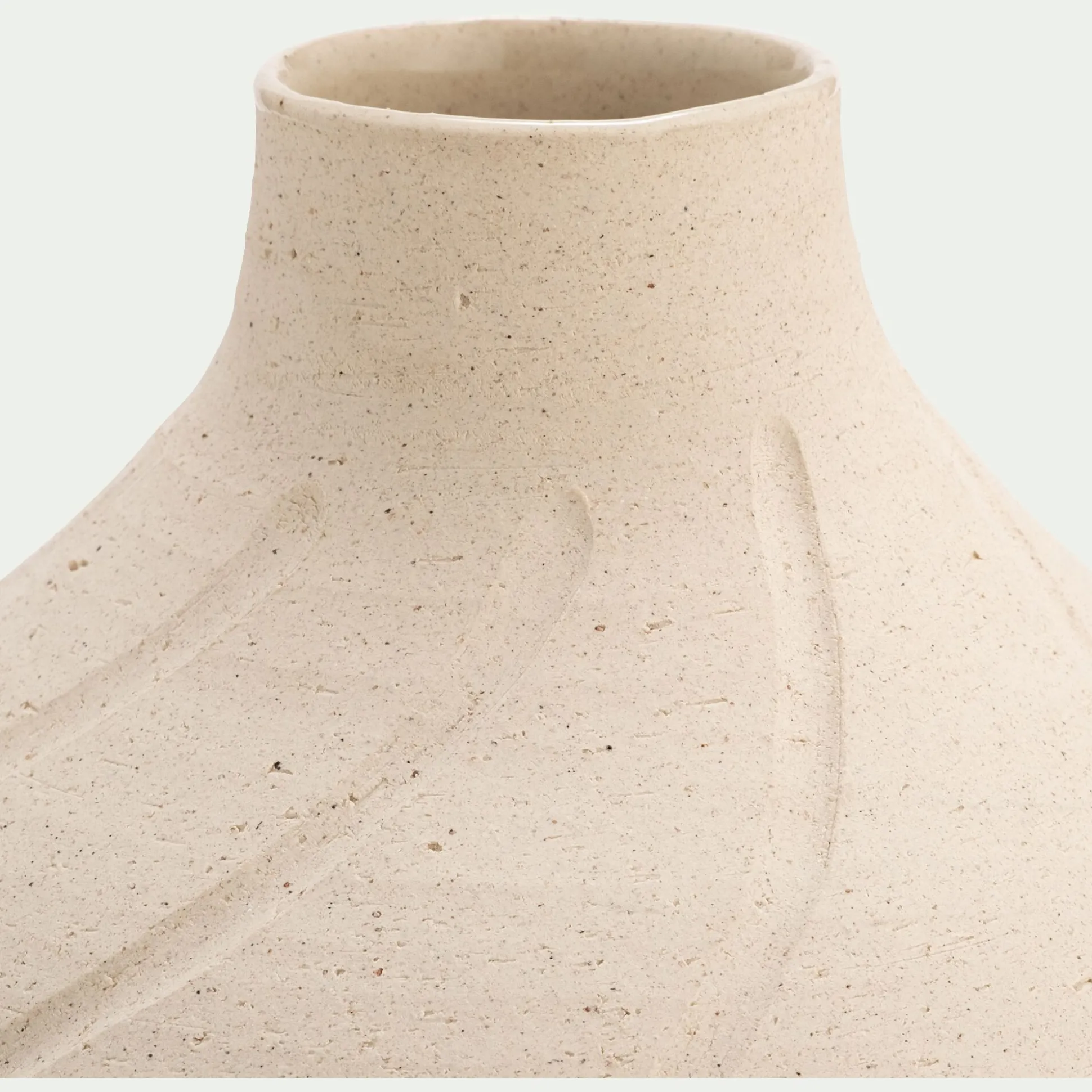 Ce vase boule en grès beige, avec ses délicates stries sculptées et sa hauteur de 14,5 cm, incarne à la perfection le mariage entre design contemporain et authenticité artisanale. Sa forme arrondie apporte une douceur visuelle, tandis que ses reliefs subtils jouent avec la lumière pour créer un effet texturé raffiné. Son fini mat et sa teinte neutre en font une pièce intemporelle, idéale pour sublimer une composition florale séchée ou s’exposer seule comme un objet d’art. Posé sur une console, une table basse ou une étagère, il s’intègre avec élégance dans un intérieur épuré, minimaliste ou haut de gamme. Un véritable bijou décoratif qui allie simplicité et sophistication avec finesse.