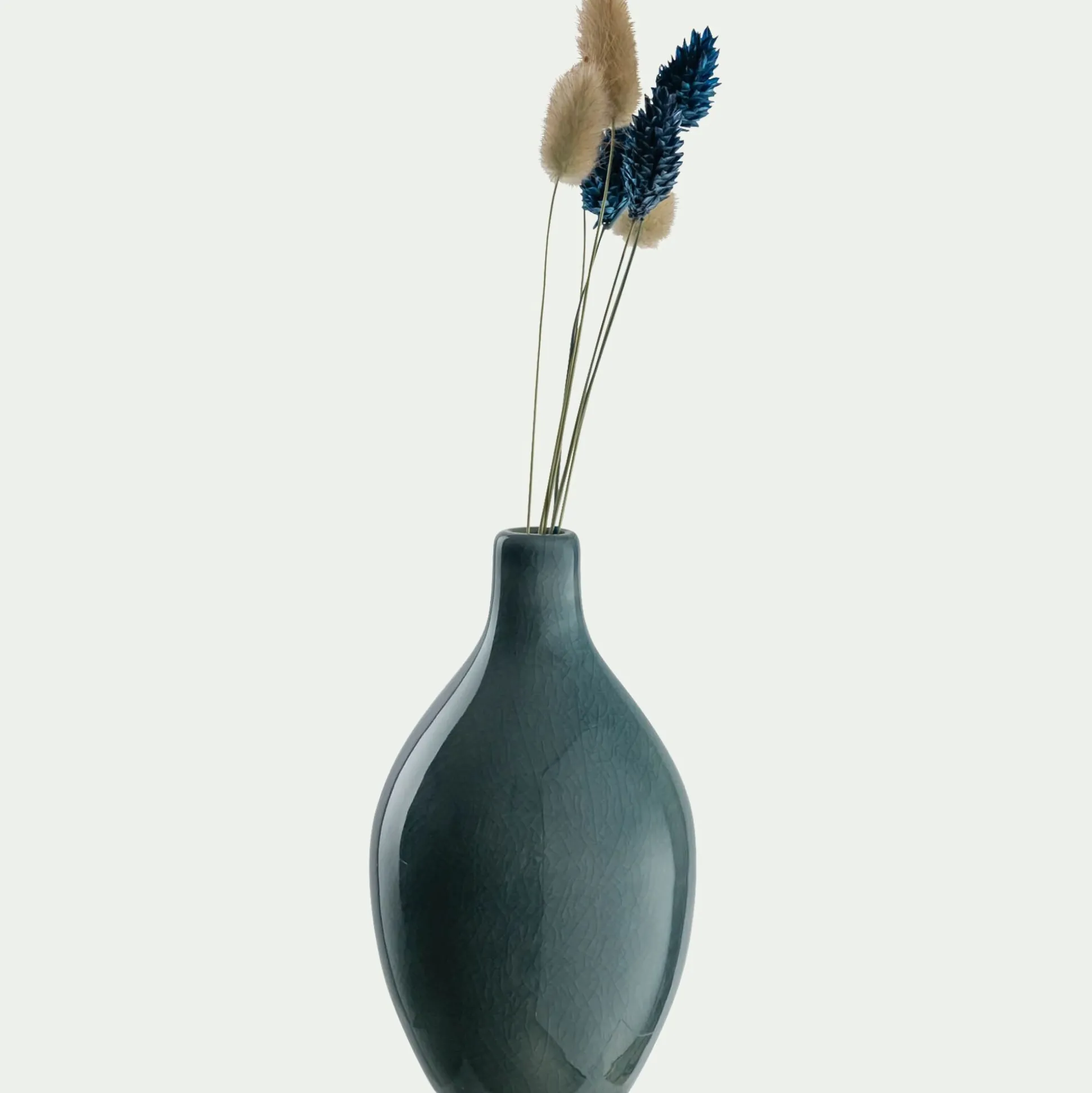 Ce vase en grès se distingue par son élégance et sa finition craquelée. Sa silhouette arrondie et son col étroit en font un objet à la fois épuré et raffiné, parfait pour accueillir une simple fleur ou une branche séchée. Sa teinte bleue, subtile et apaisante, s’harmonise avec tout type de décoration, des intérieurs les plus minimalistes aux plus colorés. Ce vase apporte une touche de douceur et de sérénité à votre intérieur, en toute simplicité.