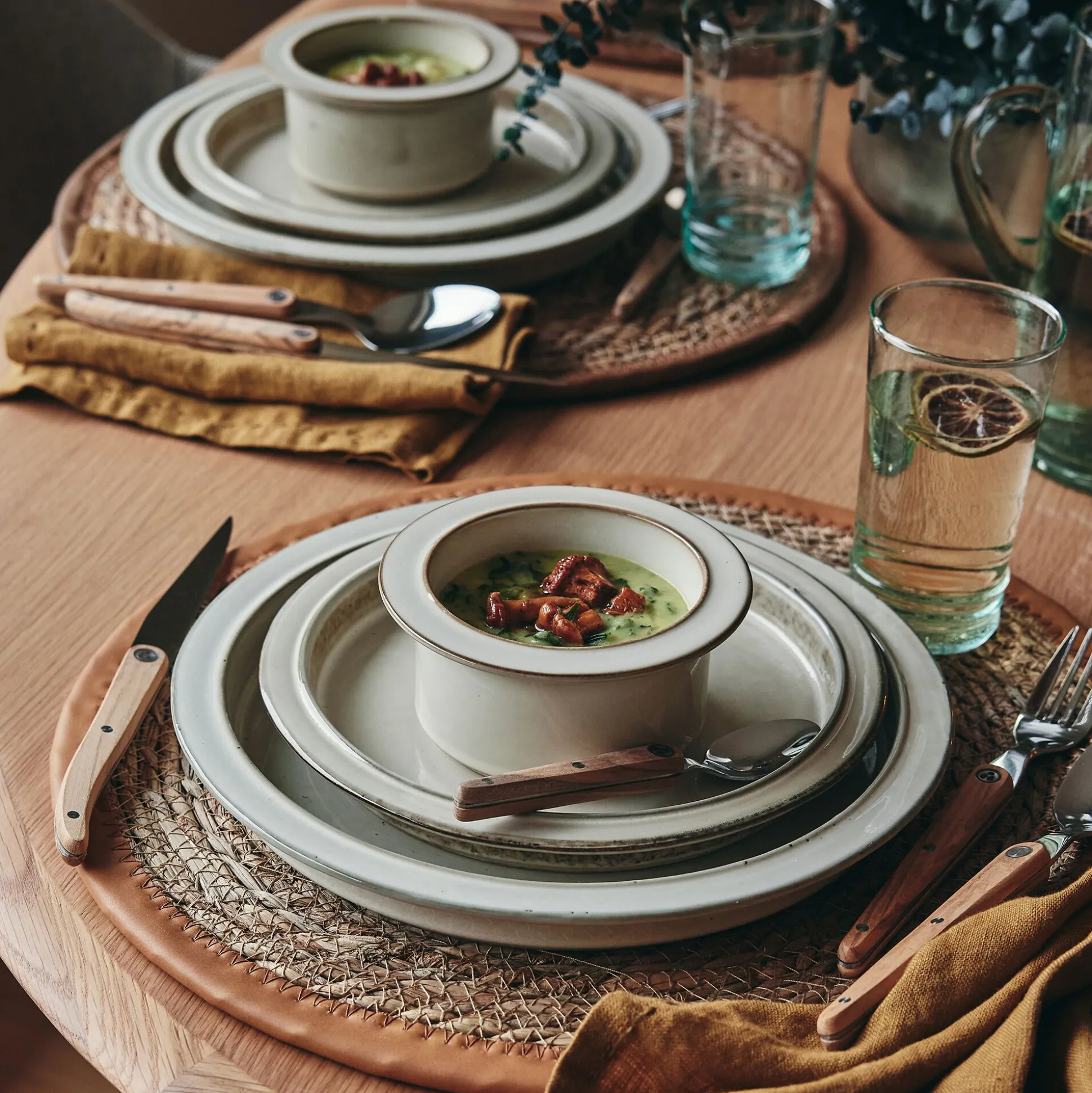 Halo est une assiette plate au style rustique, très tendance. Confectionnée en grès, elle arbore notre coloris blanc ventoux : une nuance intemporelle aux sous tons chaleureux. Le blanc présente de petites variations de couleur qui participent à une assiette au design authentique. Cette assiette ronde de 26 cm de diamètre est dotée d’un bord plat, une particularité qui sublime vos recettes et le dressage de la table.