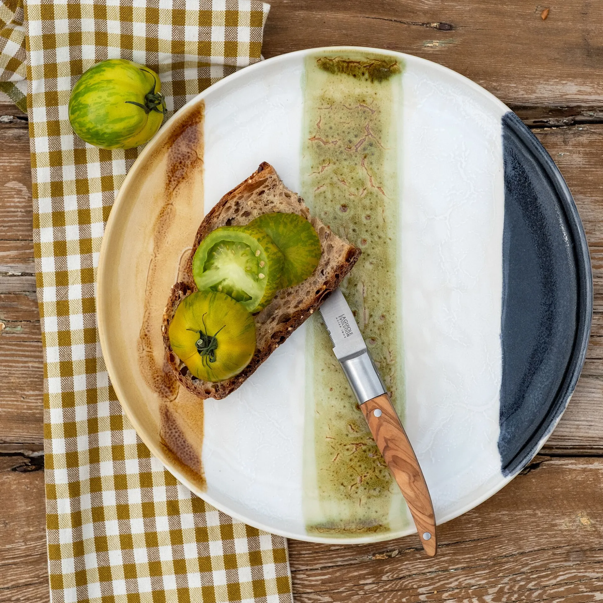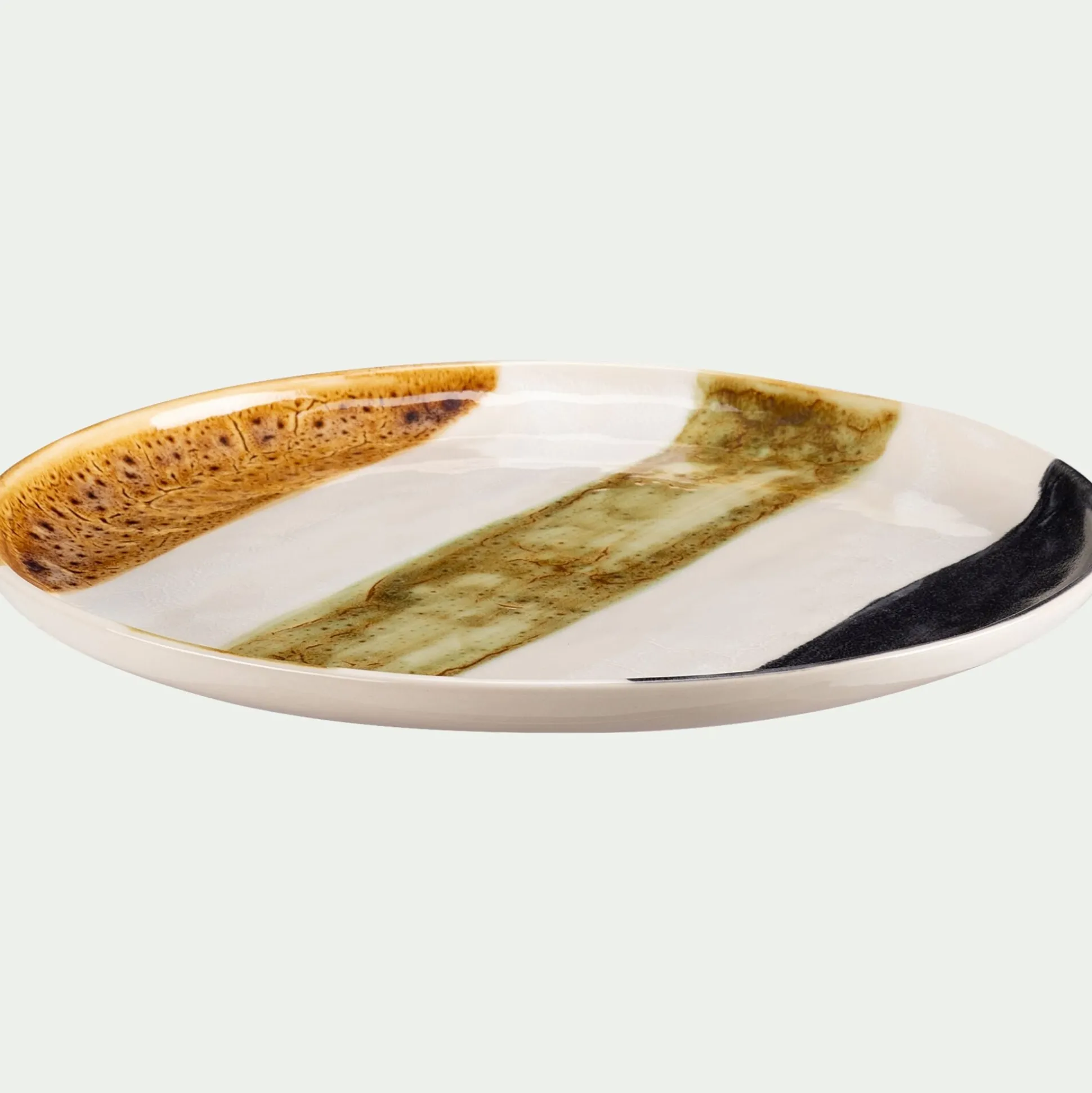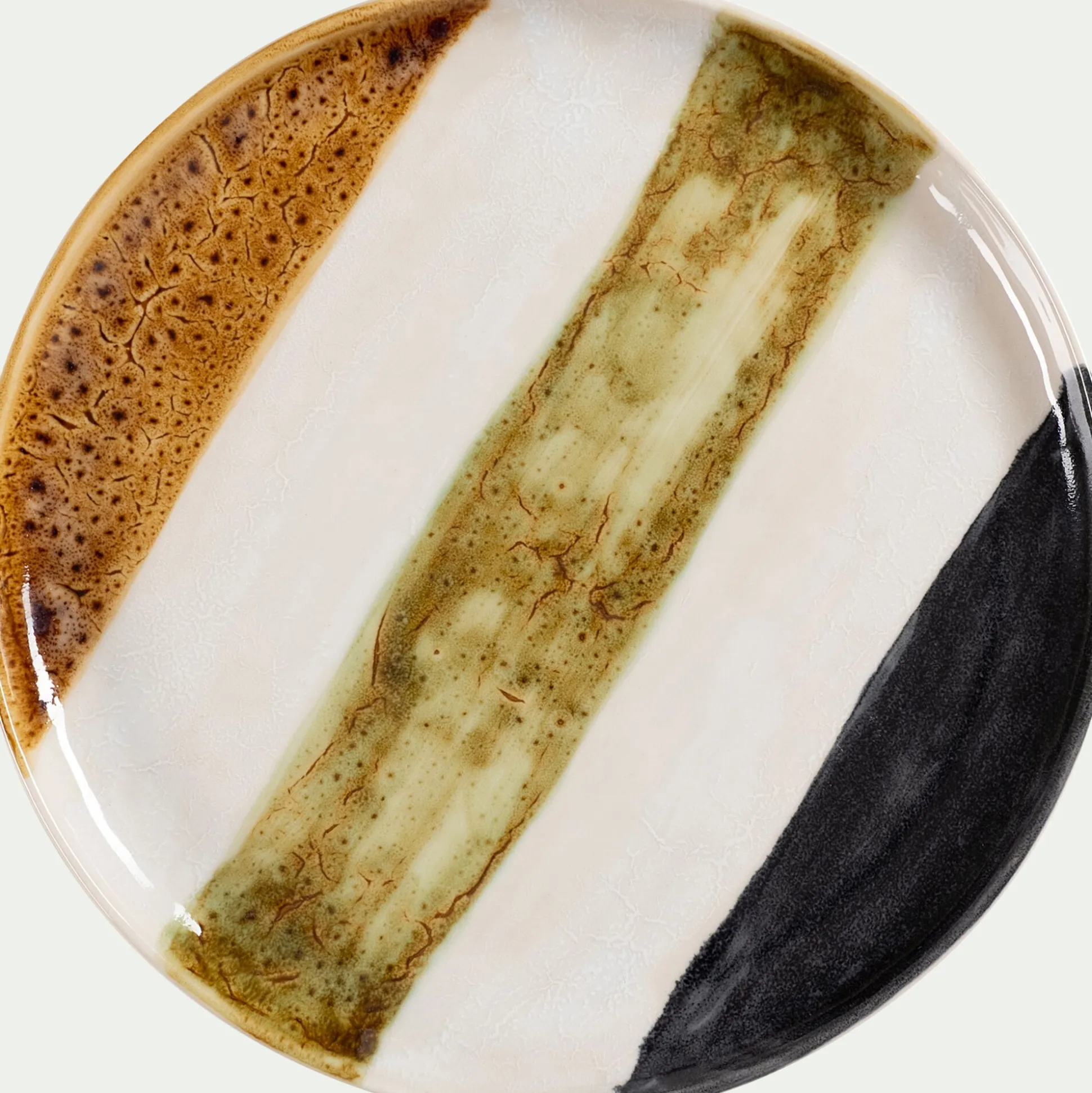 Affirmez votre sens du détail avec cette assiette plate en grès fabriquée au Portugal. Avec ses bandes colorées mêlant le brun moucheté, le vert olive et le bleu profond, chaque pièce affiche un style graphique et audacieux. Son émaillage contrasté évoque un savoir-faire authentique et apporte une vraie personnalité à votre dressage de table. Parfaite pour accueillir vos plats du quotidien ou vos recettes les plus élaborées, elle marie originalité et élégance avec naturel.