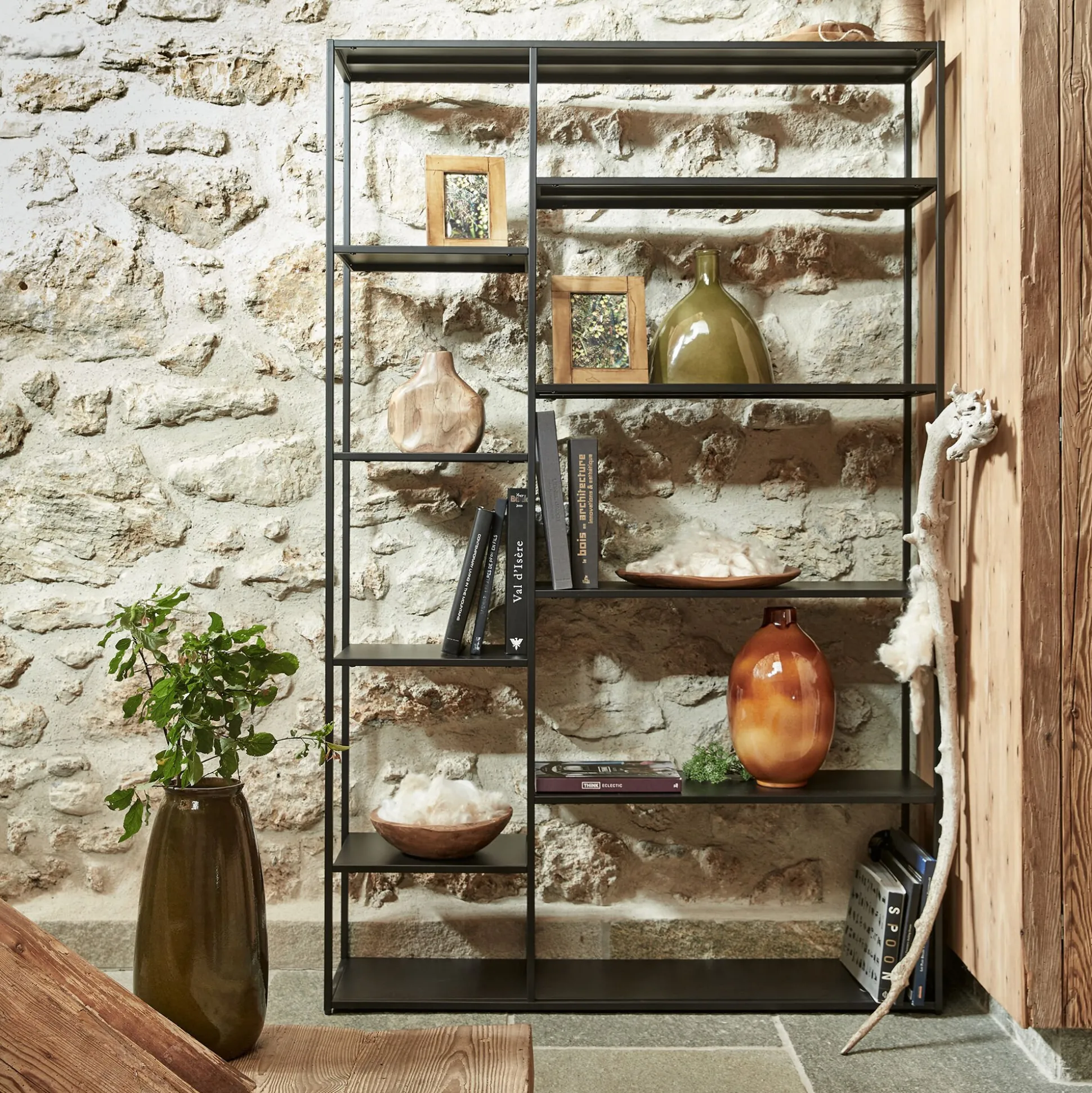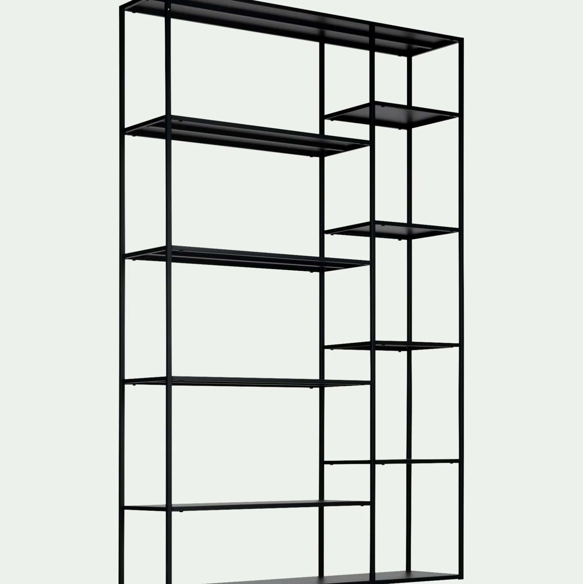 Cette belle bibliothèque à la structure fine et au style contemporain vous permettra de disposer vos objets déco et vos livres. Vous apprécierez ses lignes épurées et son design moderne. Cette bibliothèque noire présente une structure et des étagères en métal qui lui confère un style chic et élégant. Elle trouvera aisément place dans votre salon, afin de compléter avec charme la déco de votre pièce de vie et le mobilier existant.