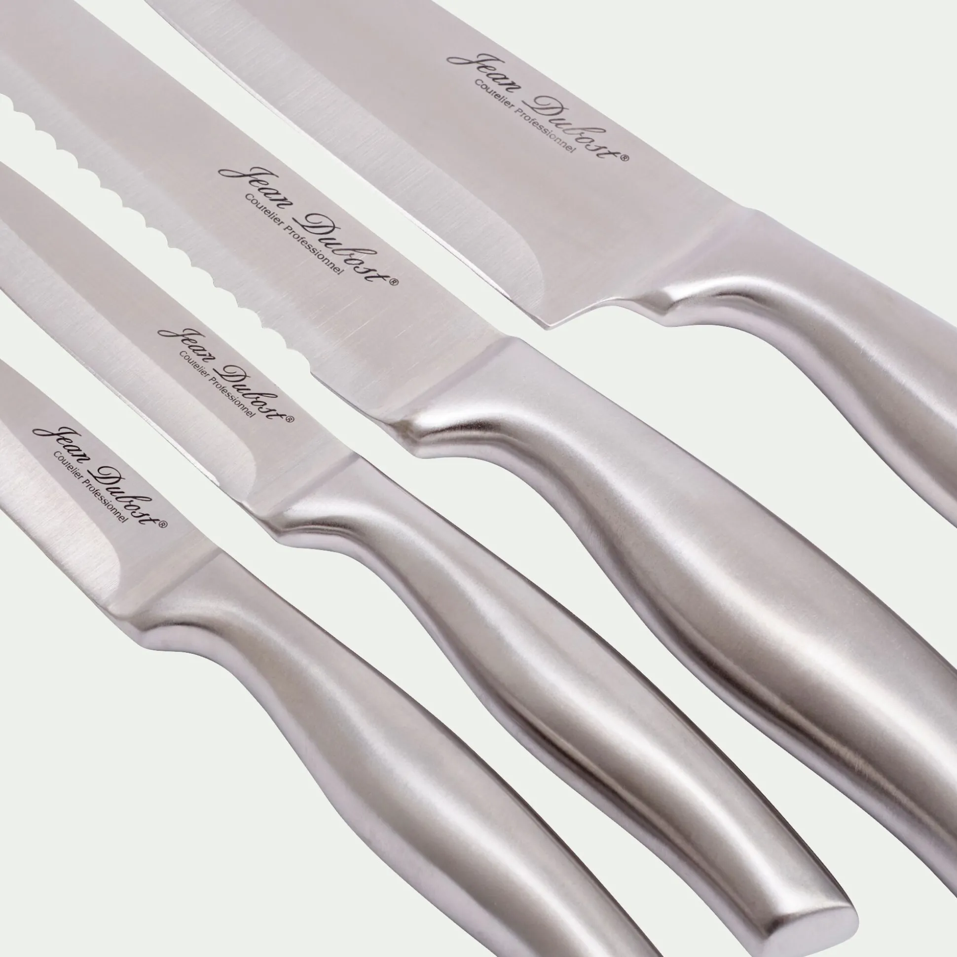Elevez votre technique en cuisine avec les couteaux Fusal. Ces 4 couteaux en inox sont présentés dans un bloc en hévéa, une essence de bois claire et chaleureuse. Chacun a sa propre fonctionnalité. Il y a donc un couteau de chef, un couteau à pain, un couteau multi-usages et enfin un couteau d’office. Ensemble, ces couteaux Jean Dubost vous permettent de réaliser tous types de tâches en cuisine. Un affuteur est inclus au support, vous permettant ainsi de garder vos couteaux toujours bien aiguisés et fonctionnels. Ce porte-couteaux en bois se glisse sur le plan de travail et reste à portée de main, tout en apportant une touche décorative à l’espace.