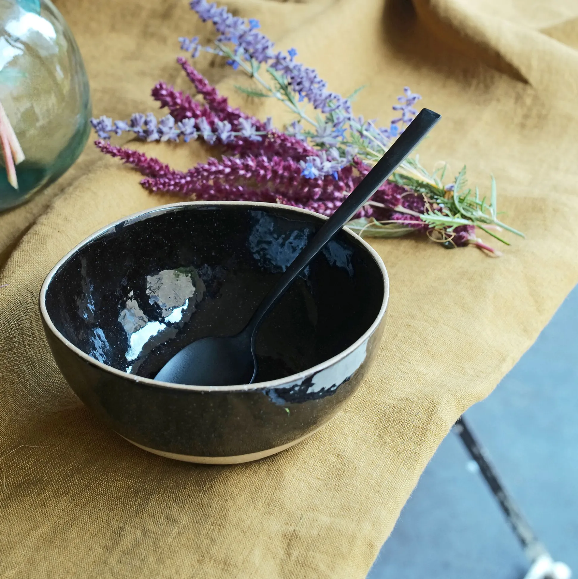 Dégustez votre boisson de petit-déjeuner, un potage ou encore une salade de fruits dans ce joli bol en grès. La terre est maniée pour offrir un rendu brut où les bords irréguliers témoignent de l’authenticité de cette pièce. Confectionné au Portugal à partir d’argile recyclée, ce bol en céramique s’inscrit dans une démarche durable. Contemporain, il arbore un engobe noir moucheté au fini brillant, associé à une base naturelle. Un mélange des styles dont on raffole pour sublimer n’importe quelle table.