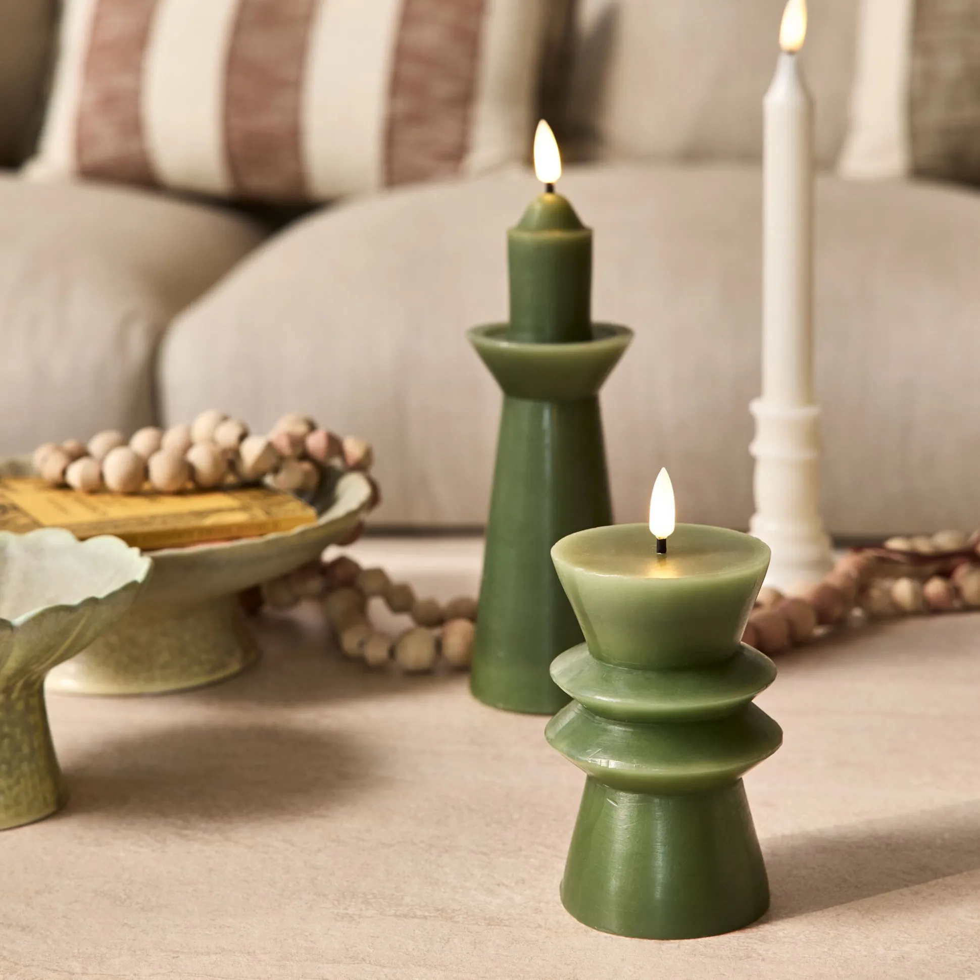 La bougie à LED Naya associe authenticité et praticité. Confectionnée en véritable cire de paraffine, elle affiche une silhouette contemporaine teintée en vert, élégante et moderne. Une petite ampoule en forme de flamme trône au sommet et diffuse une lumière blanc chaud, douce et apaisante. Fonctionnant avec 2 piles AA (non incluses), elle s’allume grâce à un interrupteur discret placé sous la bougie. Pour plus de confort, son minuteur intégré l’éteint automatiquement après 6 heures d’utilisation continue. Un objet déco qui crée une atmosphère chaleureuse sans contrainte.