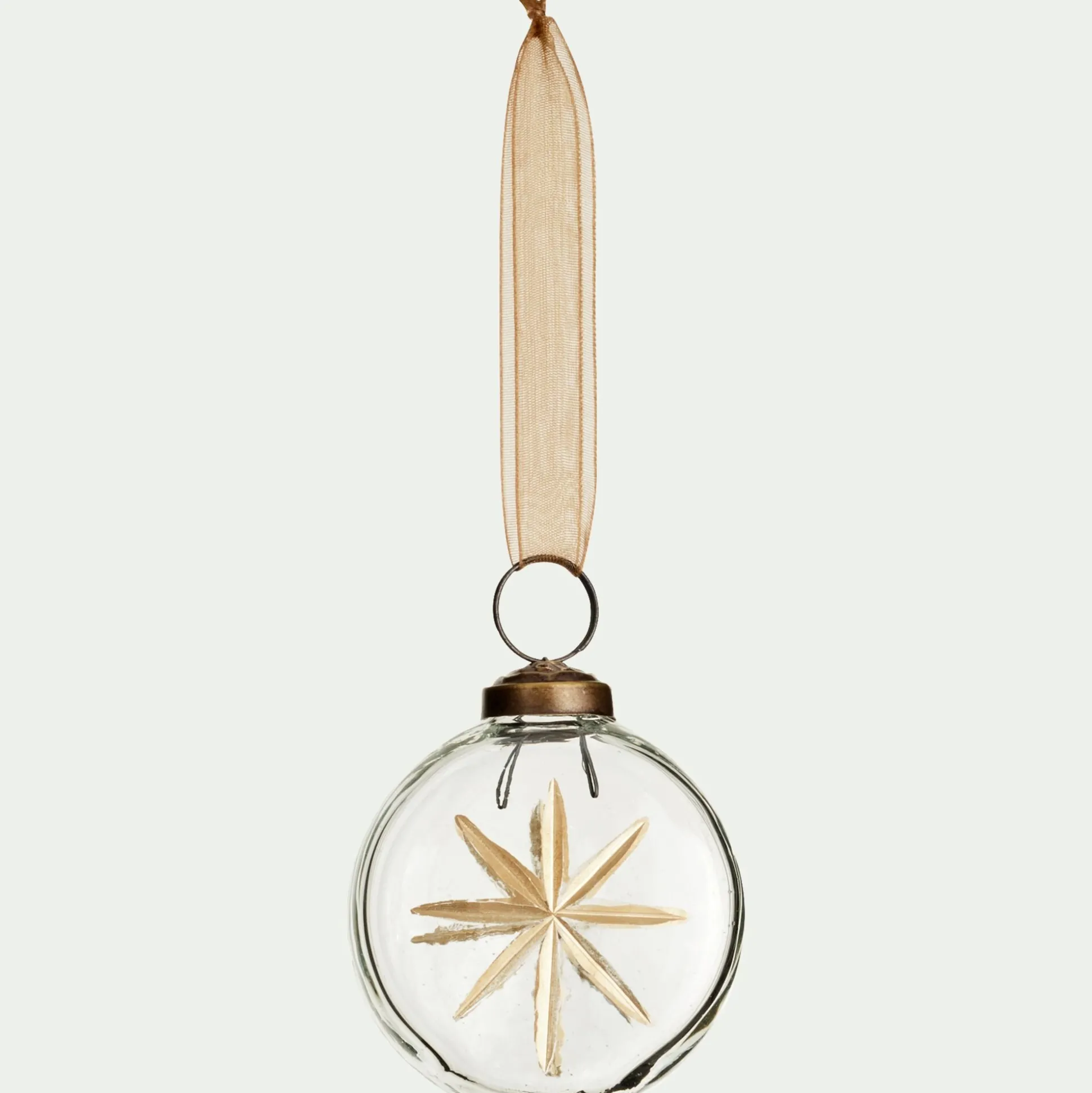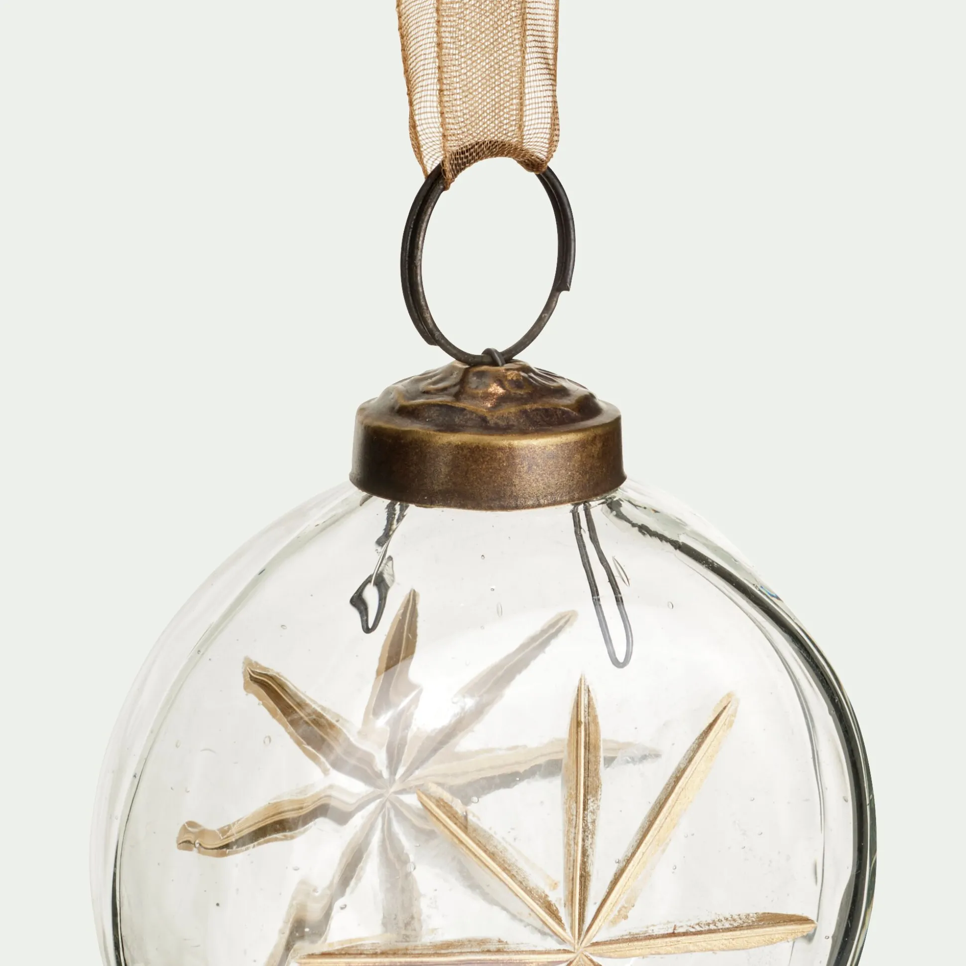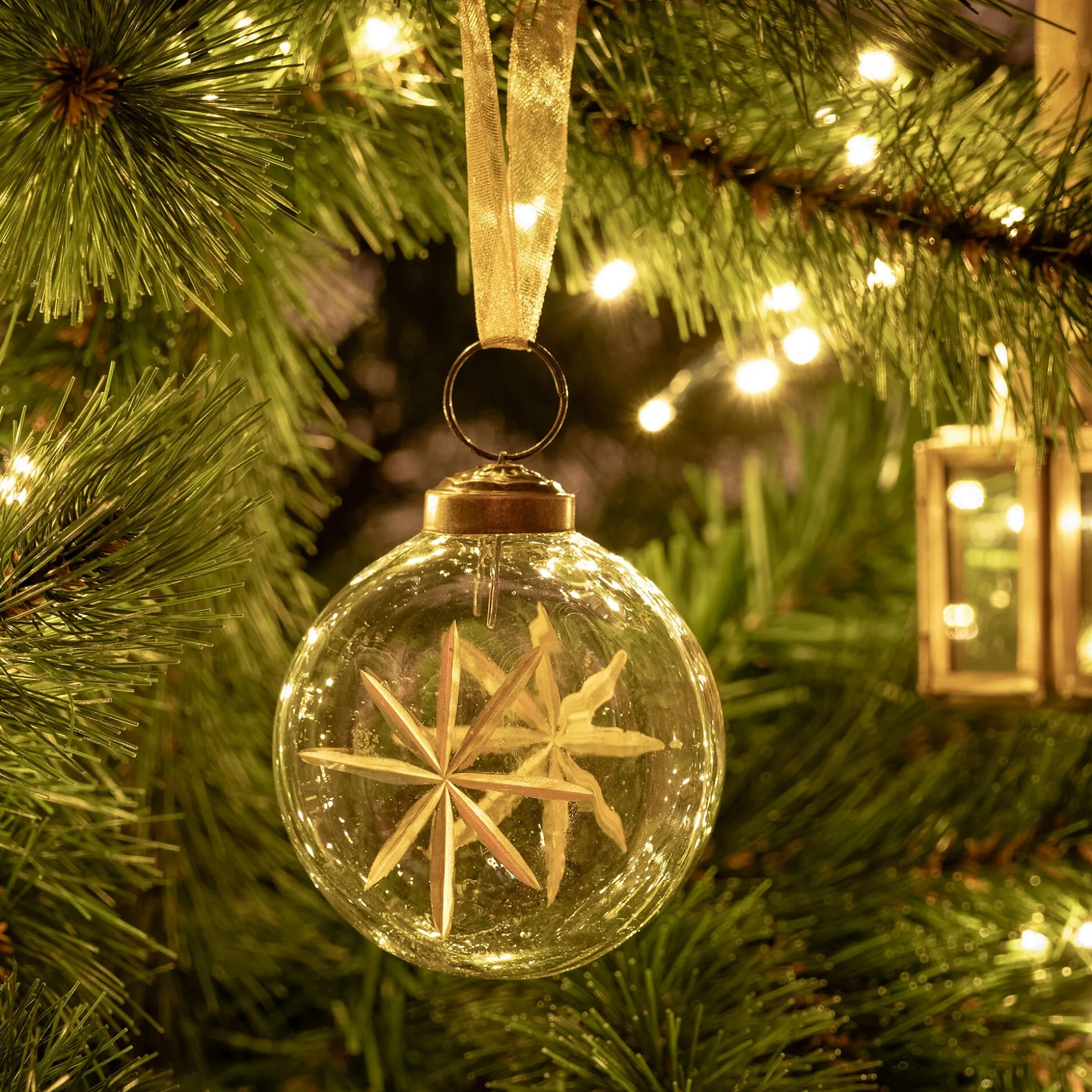 La boule de Noël Krusa présente une forme atypique. Complètement aplatie, elle apporte une touche résolument originale au sapin. En verre transparent, ces décorations de Noël laissent apparaitre une étoile dorée en son cœur. Inspirées de la lumière, ces boules de Noël plates symbolisent l’éclat et la magie des fêtes. Accompagnées d’un ruban doré pour les suspendre, ces boules apportent une touche de sophistication et de féérie à votre décoration.