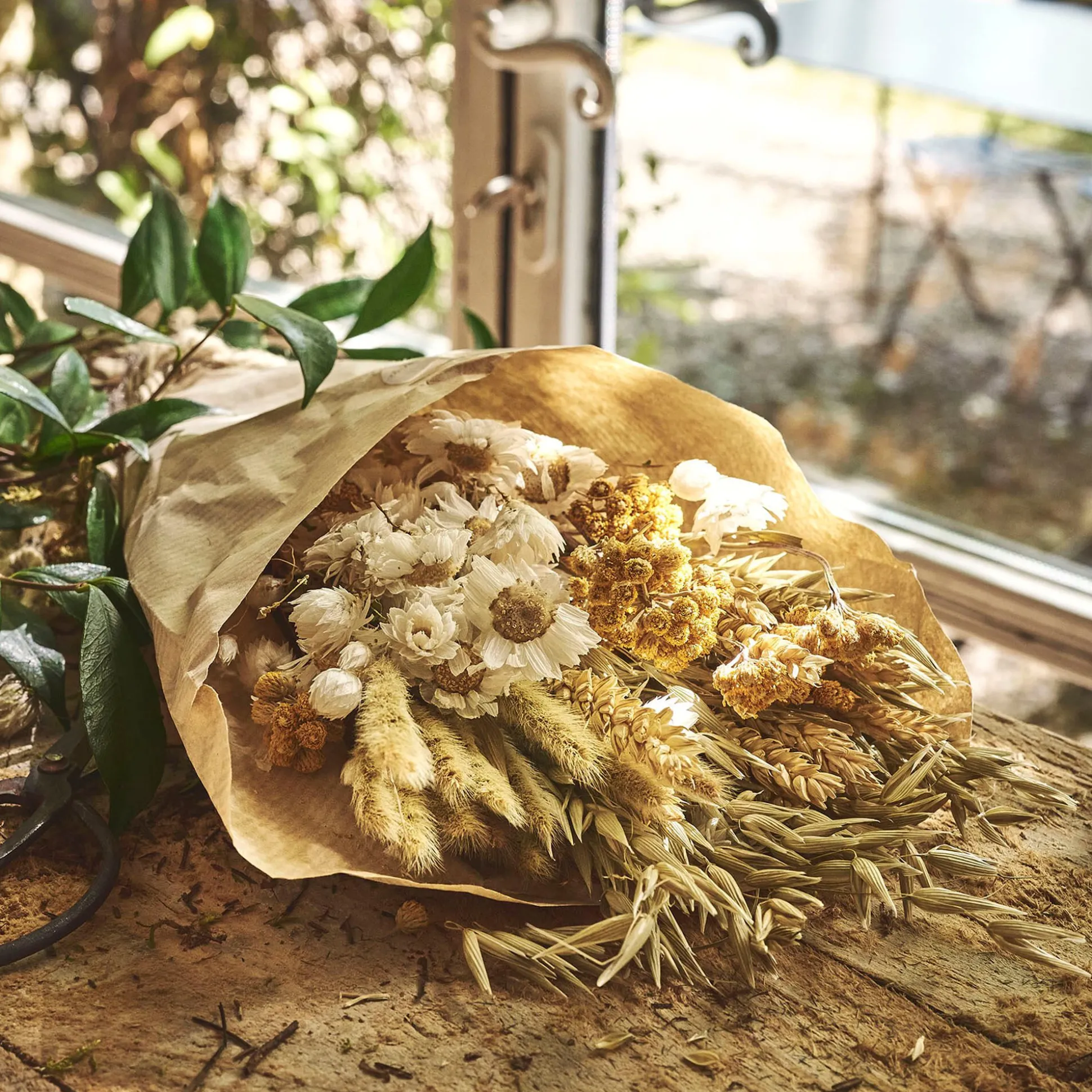 Un magnifique arrangement de fleurs séchées finement sélectionnées. Ce bouquet allie des fleurs de rhodante, de triticum, d’avena de polypogon et de lona. Cette botte aux couleurs jaunes donne une touche de lumière à votre pièce. Que ce soit pour égayer un vase sur une table basse ou pour confectionner de ravissantes créations manuelles telles qu’un herbier ou une bougie déco, ce bouquet de fleurs séchées est l’alliance parfaite entre élégance subtile et charme naturel.