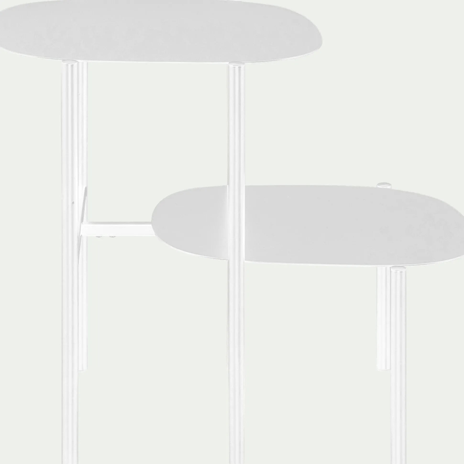 Ce bout de canapé tire son originalité de sa forme. En effet, cette petite table présente deux plateaux ovales à deux hauteurs différentes. L’un est très bas, à environ 25 cm du sol, alors que le second plateau le surplombe à 50 cm du sol. Cette table double s’installe dans le salon, près du canapé. Elle accueille vos livres, vos télécommandes ainsi que les autres accessoires du salon. Ce bout de canapé en métal arbore un coloris blanc, brillant qui s’accorde à toutes les couleurs de canapé. Une petit meuble lumineux qui habille la pièce.
