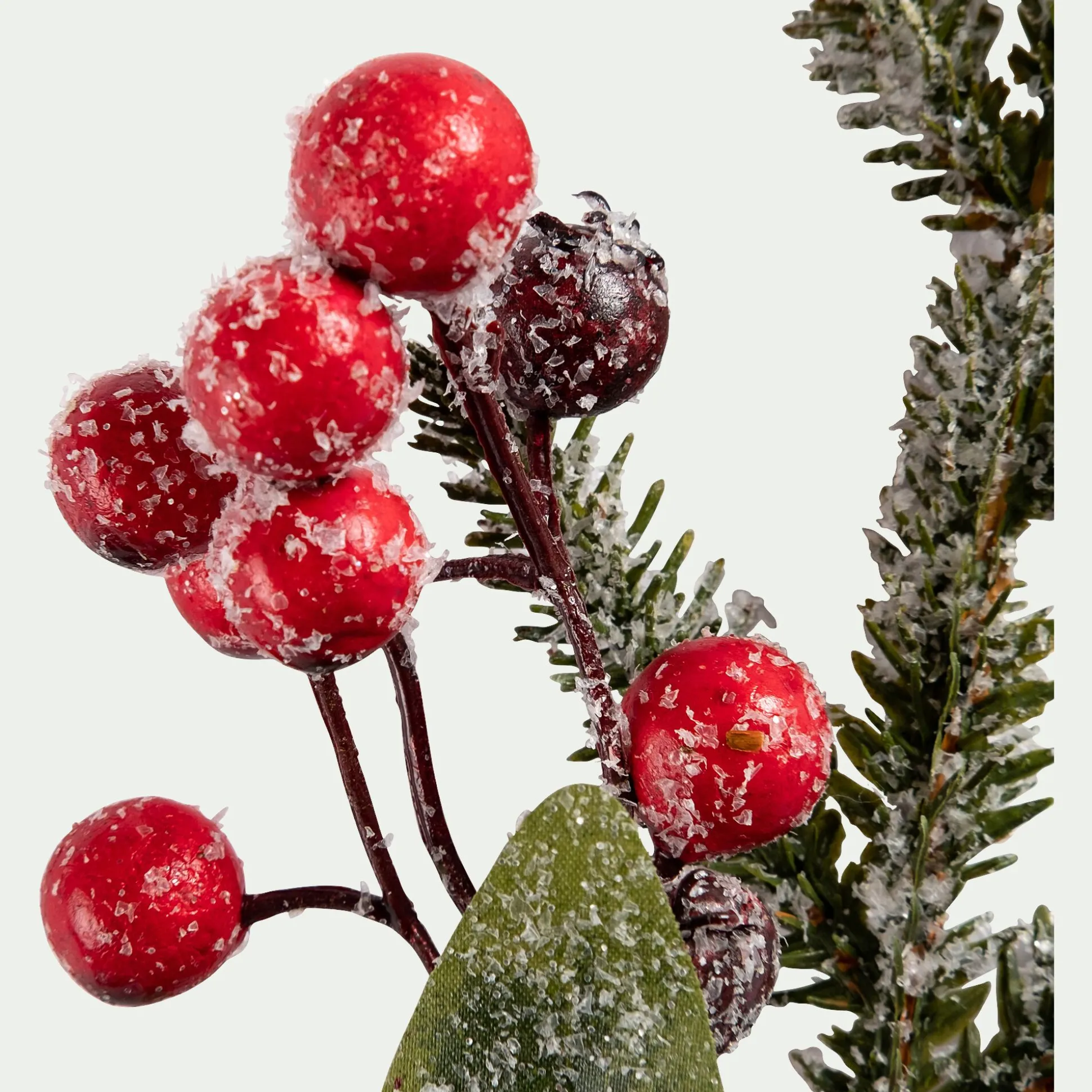Feuilles, baies rouges, pommes de pin et effet givré.