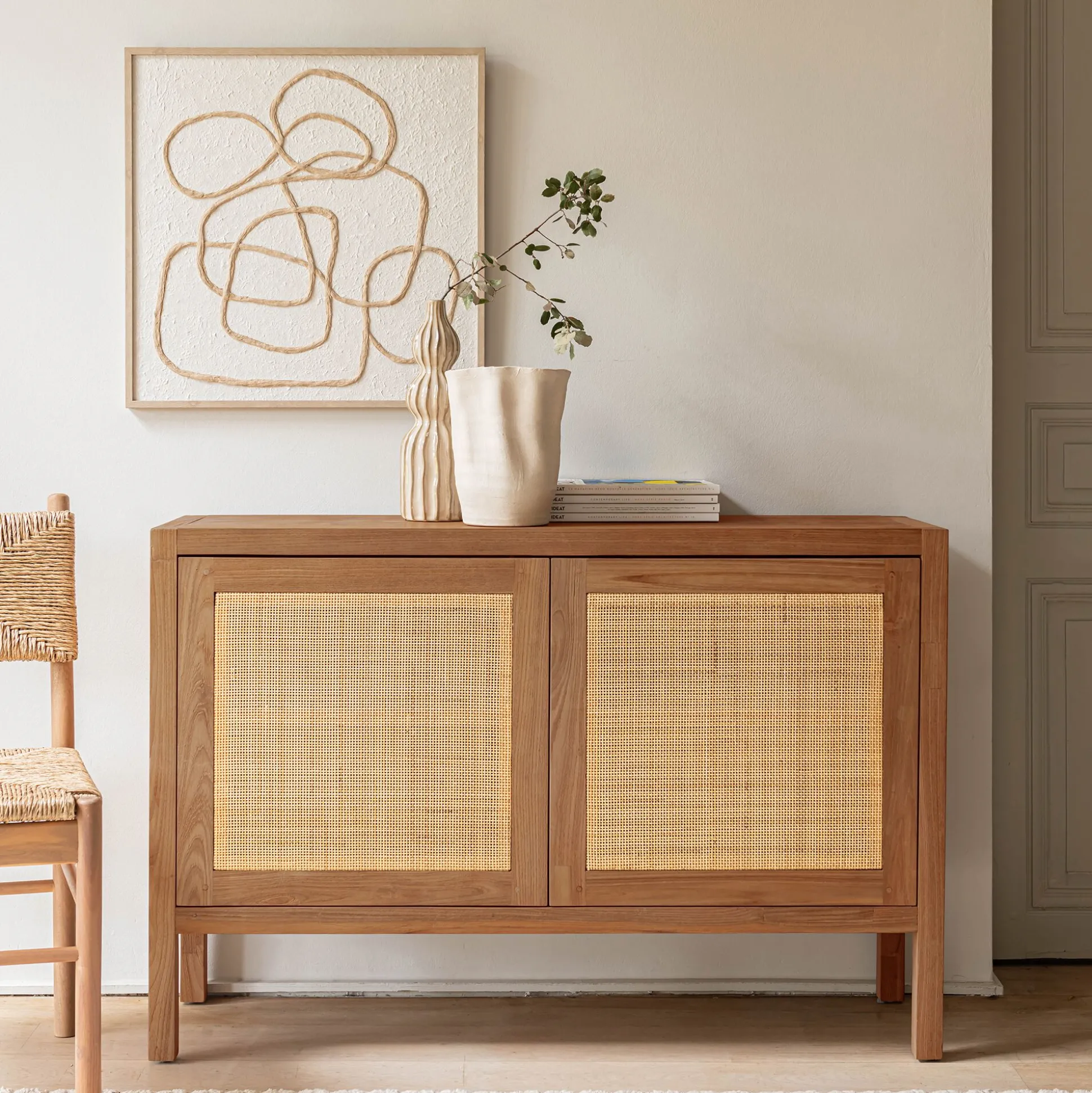 Buffet bas en teck recyclé et cannage