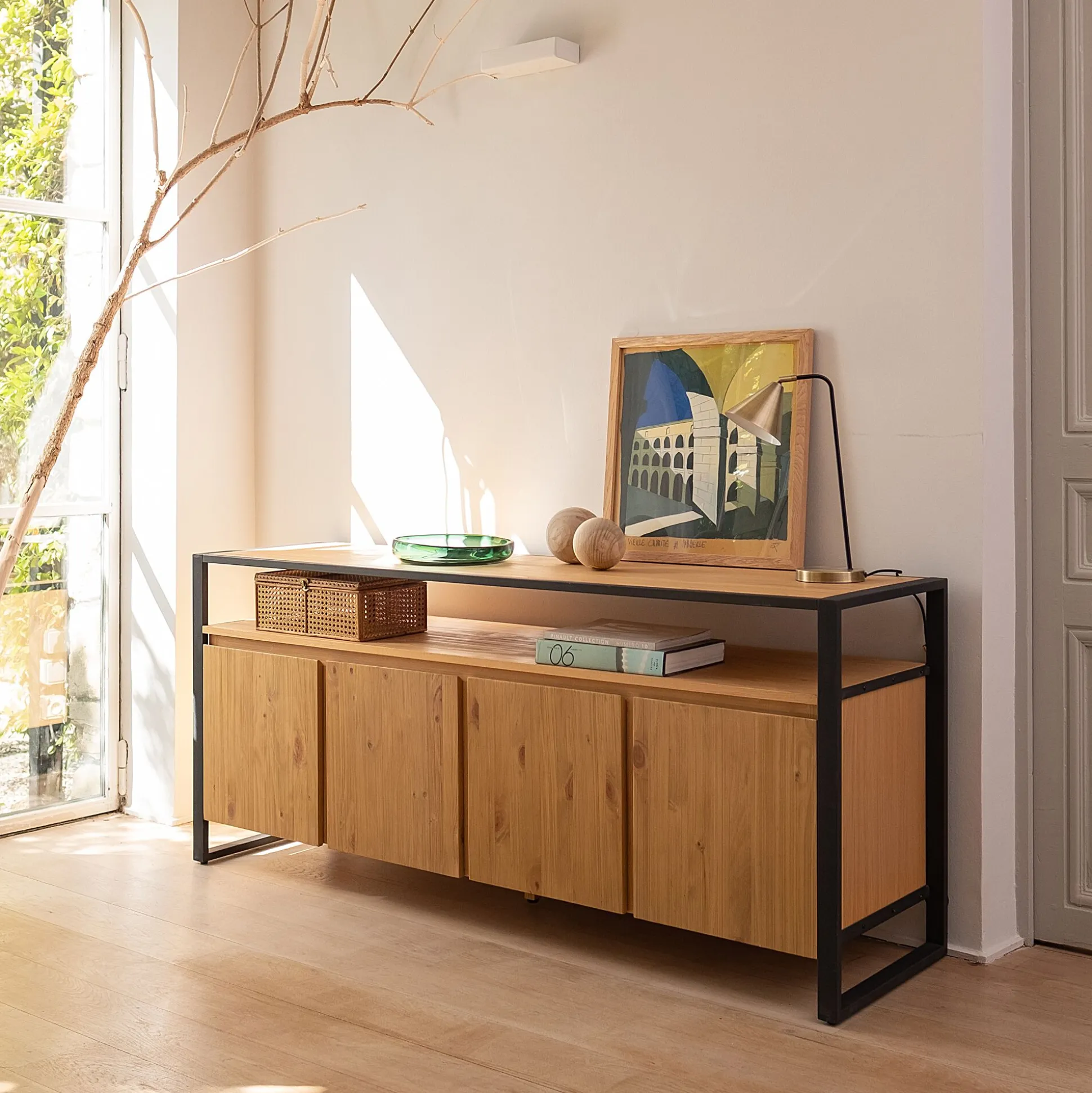 Ce joli buffet, qui tire son nom d’un quartier marseillais, réussit à la perfection l’alliance entre la robustesse du métal et la chaleur du pin massif. Ses 4 portes renferment 6 compartiments qui pourront accueillir vaisselle et verres. Le mélange de métal et de bois donne un style atelier à son ensemble, un meuble adapté à une atmosphère inspirée par les matières brutes et des teintes chaleureuses.