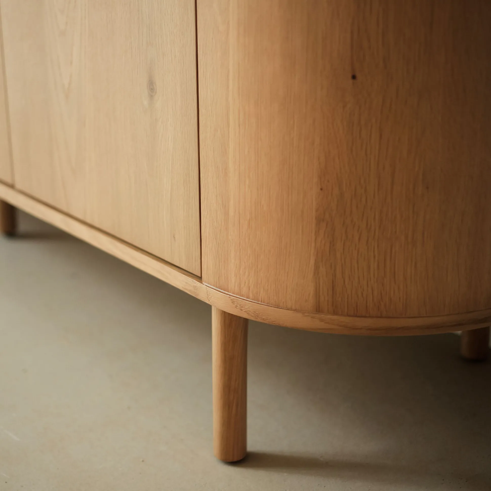 Découvrez ce magnifique buffet en bois au design intemporel, idéal pour sublimer votre intérieur. Ce buffet bas, avec sa forme ovale et ses angles arrondis, ajoute une touche de douceur et de sérénité à votre espace de vie. À la fois esthétique et fonctionnel, il est doté de quatre portes battantes et de deux étagères intérieures, offrant un espace de rangement généreux et bien organisé.