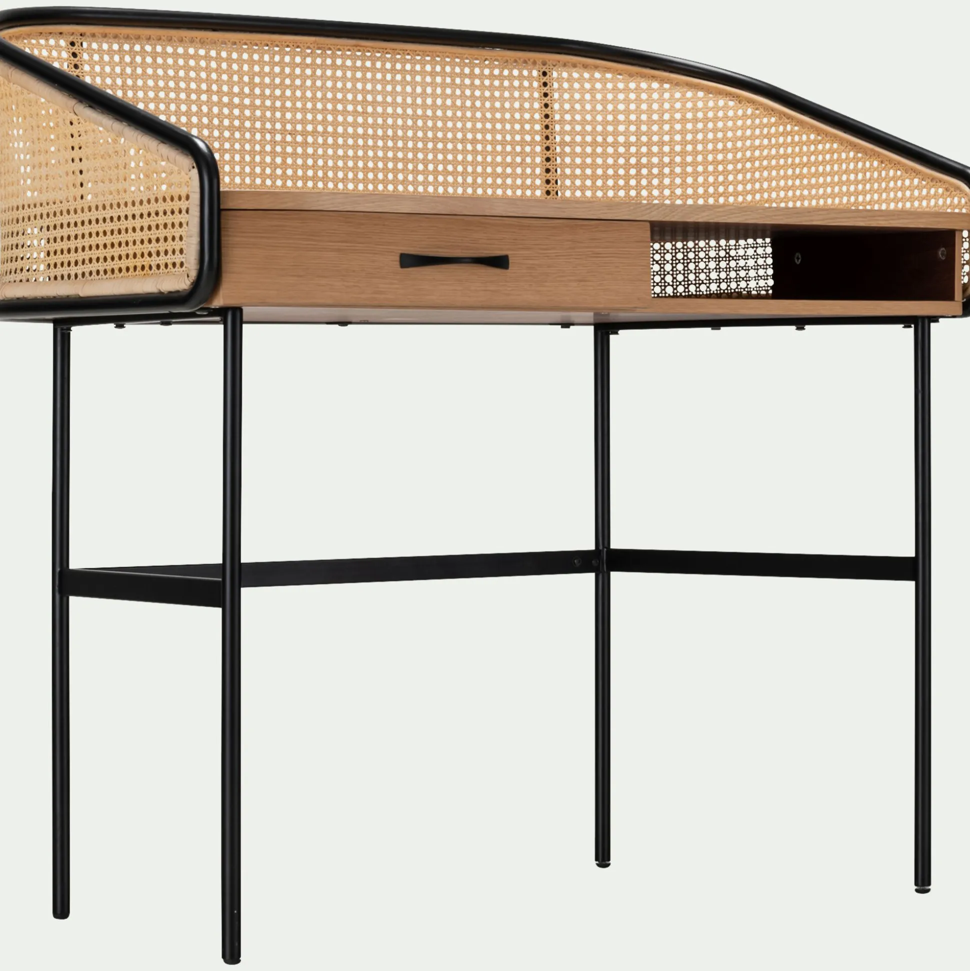 Pour booster votre motivation et votre concentration, faites de votre espace de travail un coin agréable. Avec le bureau en bois Nori, la pièce devient plus chaleureuse et accueillante. Elle gagne également un côté design, très apprécié pour se sentir bien chez soi. Ce bureau présente un plateau en bois, agrémenté de deux espaces de rangement (un tiroir et une niche). Ce plateau plaqué en chêne repose sur un piètement en métal noir. Le tout est surmonté d’une finition en rotin. Très en vogue, le cannage apporte un côté chic et exotique à ce meuble. Associé au bois courbé, le cannage vante le modernisme et la douceur. Ce bureau en cannage est une très belle pièce à laquelle on apprécie s’installer pour travailler.