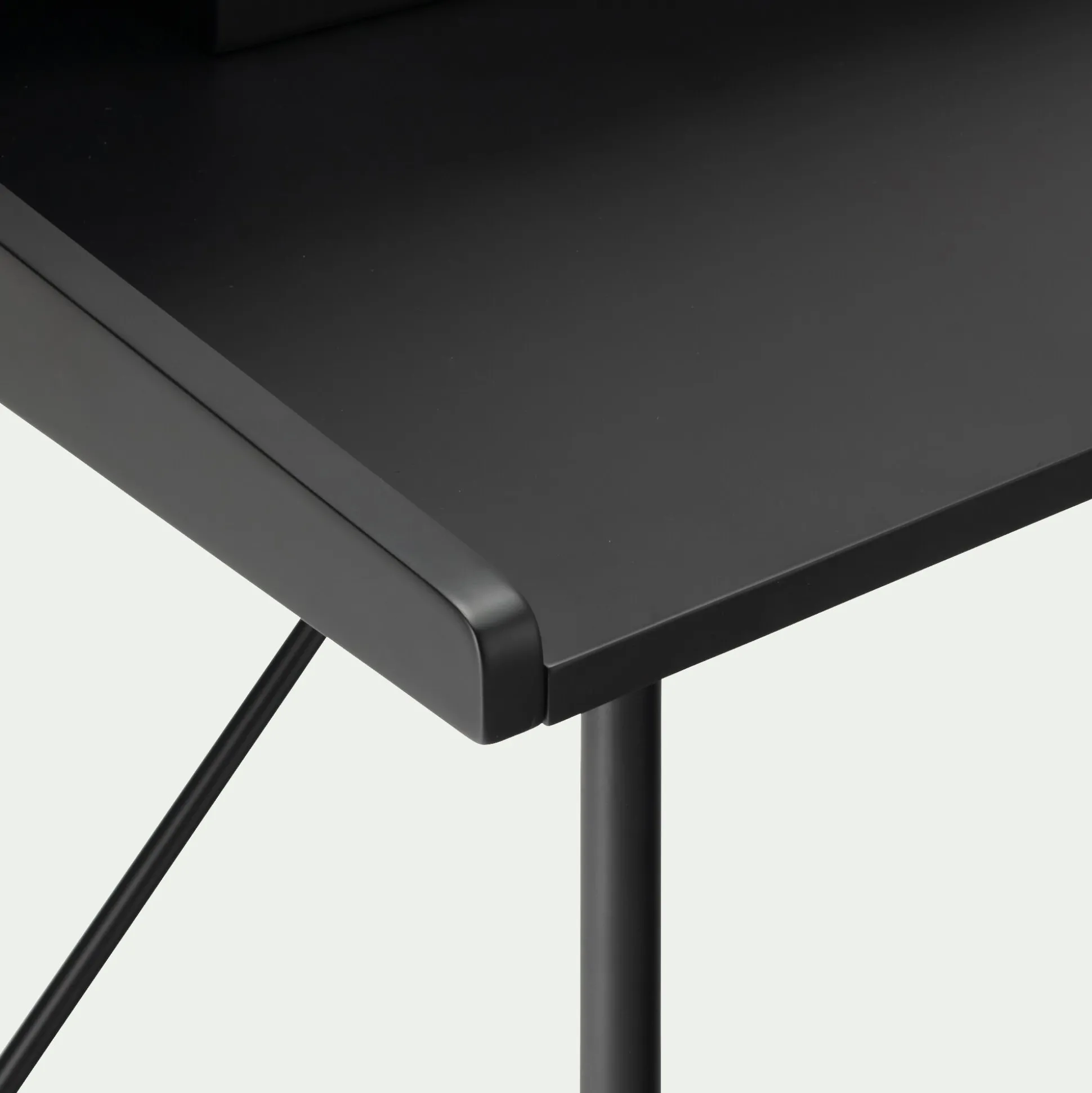 Lira est un bureau en bois aussi esthétique que pratique. Du plateau au piétement, ce bureau de travail est entièrement peint en noir mat. Ainsi, ce meuble d’accent apporte du contraste et de la profondeur à la pièce. Son total look noir le rend adaptable à tous les styles : moderne, contemporain, industriel… Un intemporel qui s’adapte aux saisons et à vos goûts. Ce bureau noir se compose d’un grand plateau principal et d’un petit plateau supérieur, idéal pour poser votre écran d’ordinateur. De cette façon, votre corps adopte naturellement une posture saine. Deux boîtes de rangement viennent compléter l’ensemble. L’occasion d’avoir un bureau organisé où travailler devient un plaisir.