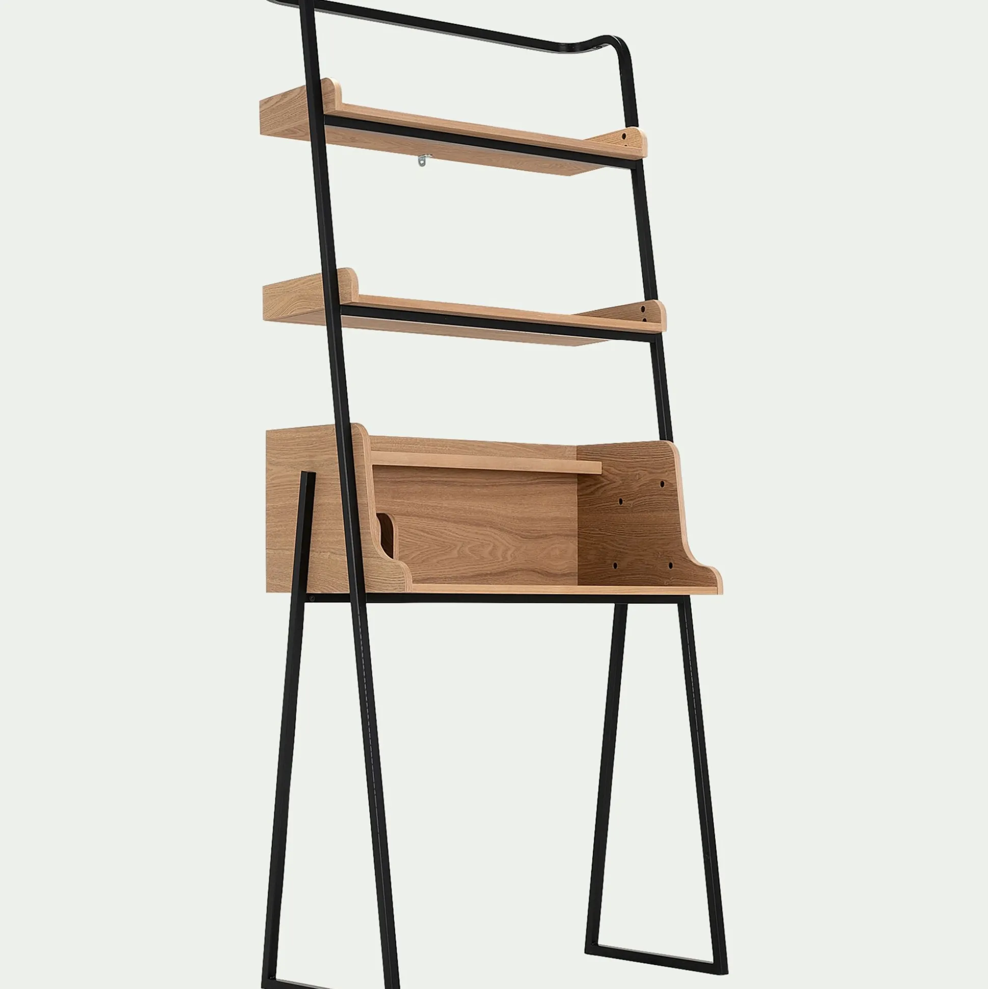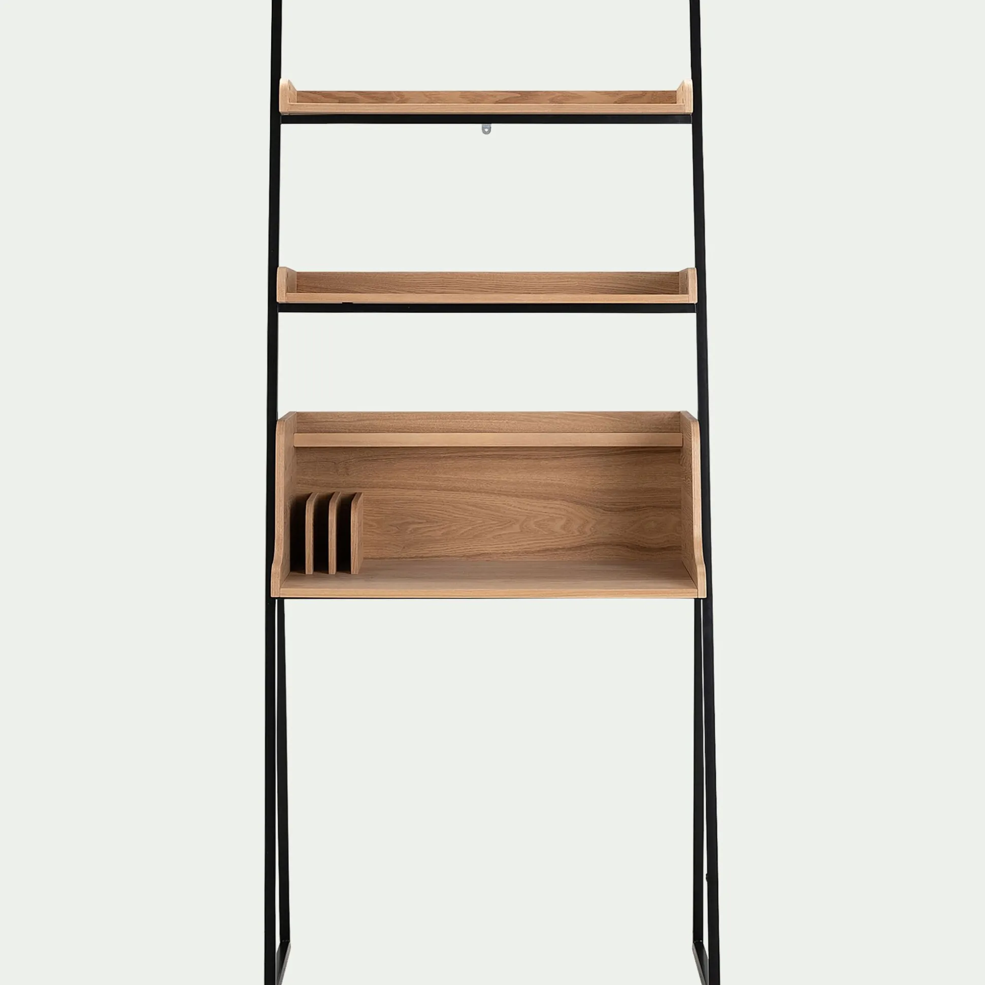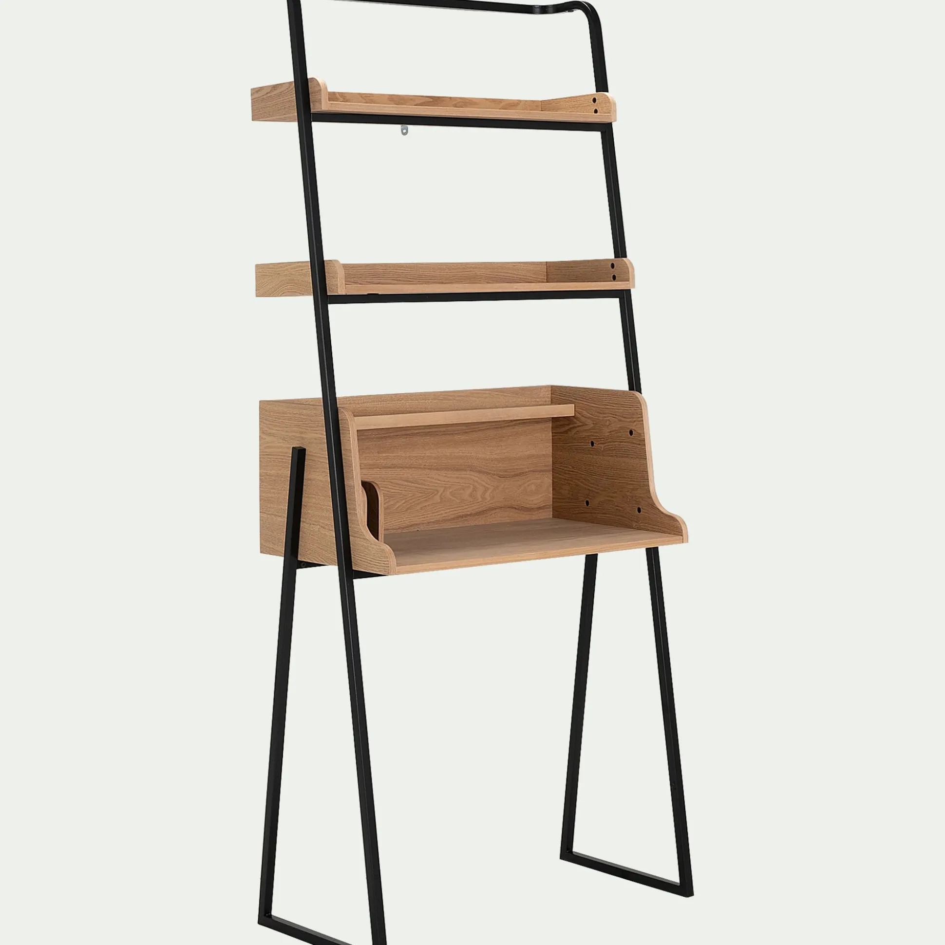 Ce bureau à la teinte claire séduit par ses lignes travaillées et son jeu de matière. Sa largeur de 80 cm offre la possibilité d’ajouter un espace bureau dans de petites pièces. Deux étagères surplombent le bureau pour y ranger documents et livres ou y ajouter une note décorative. Le bois clair de son coloris frêne suggère un style raffiné, plein de caractère, idéal pour un intérieur contemporain. Sa forme oblique, esprit échelle ajoute un relief bien pensé à ce joli meuble. La gamme Estanier se décline dans différentes versions et coloris qui lui permettent de s’utiliser seule ou en combinaison.