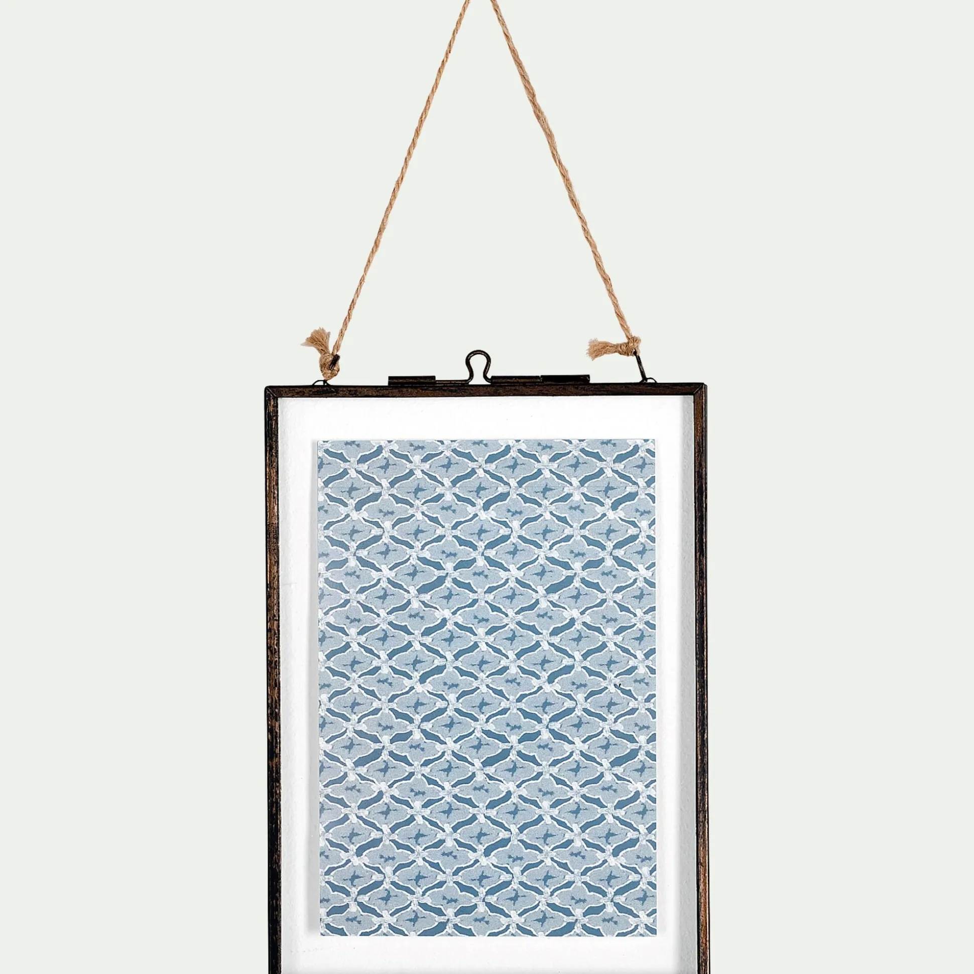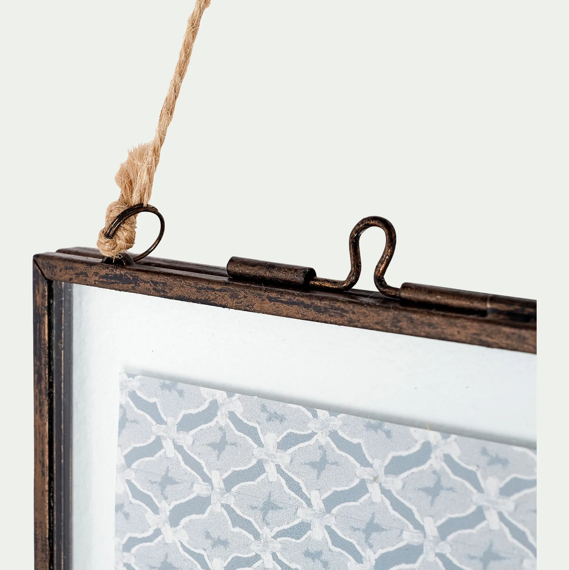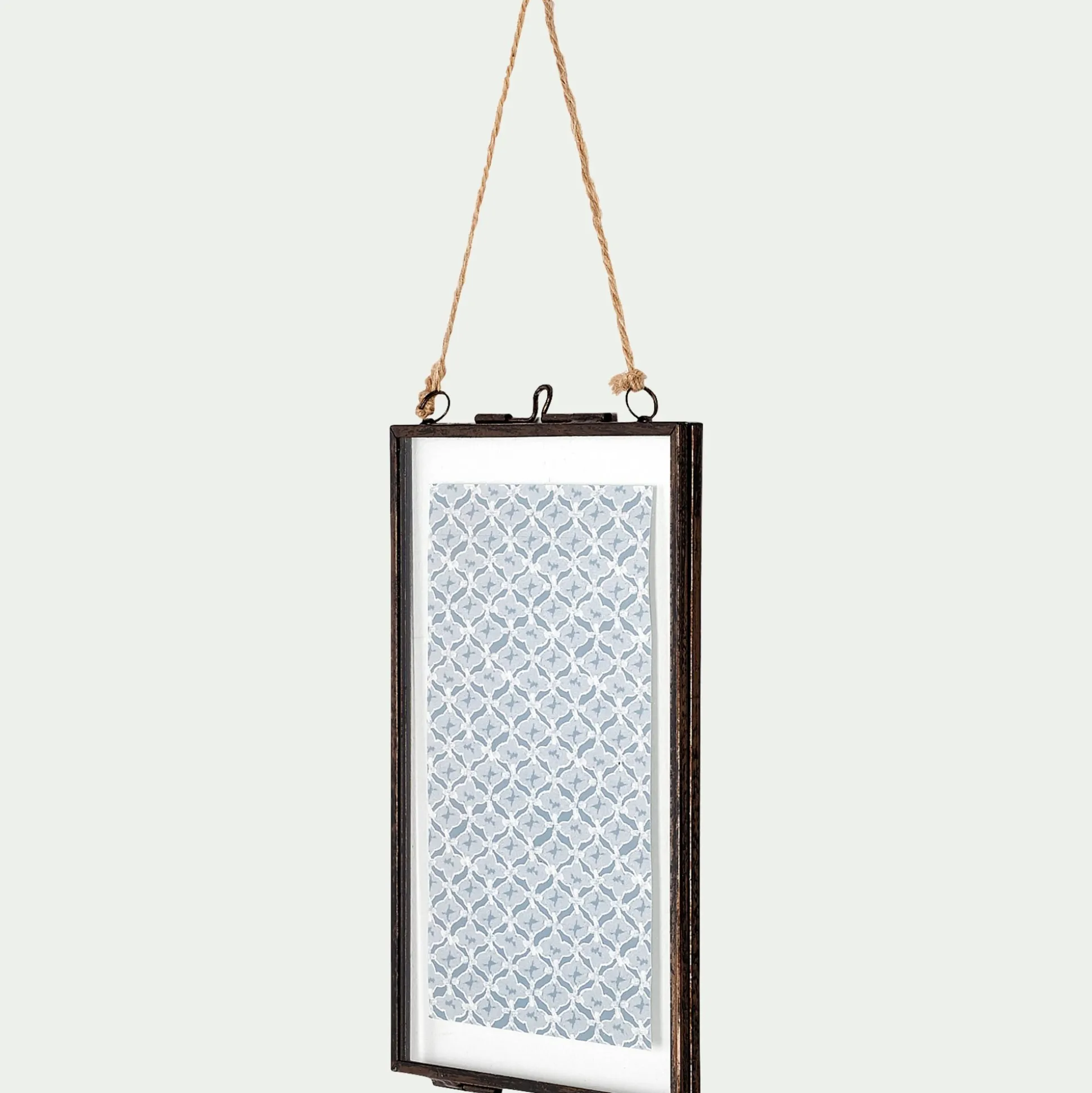 Le cadre Corto fait écho aux villages folkloriques du Portugal. Son fer noir, attaqué par la corrosion, semble avoir bravé les rafales salées de la côte ibérique. Au charme ancien, ce cadre incarne une relique que l’on imagine trônant sur le mur d’une cabane de pêcheur abandonnée. Il s’ouvre par sa partie supérieure, grâce à un loquet à poucier qui semble résister au temps. La devanture en verre s’ouvre et laisse apparaître un motif bleu vieilli, évoquant les azulejos, art ancestral hérité de la culture Maure. Le tout tenu par des bagues et un cordage qui s’effile, le rendu est troublant. Conservez ce clin d’oeil méditerranéen ou remplacez le par une photo personnelle. Peu importe votre choix, le cadre Corto tranchera et donnera du cachet à votre intérieur, comme un objet chargé d’histoire, sorti des abîmes.