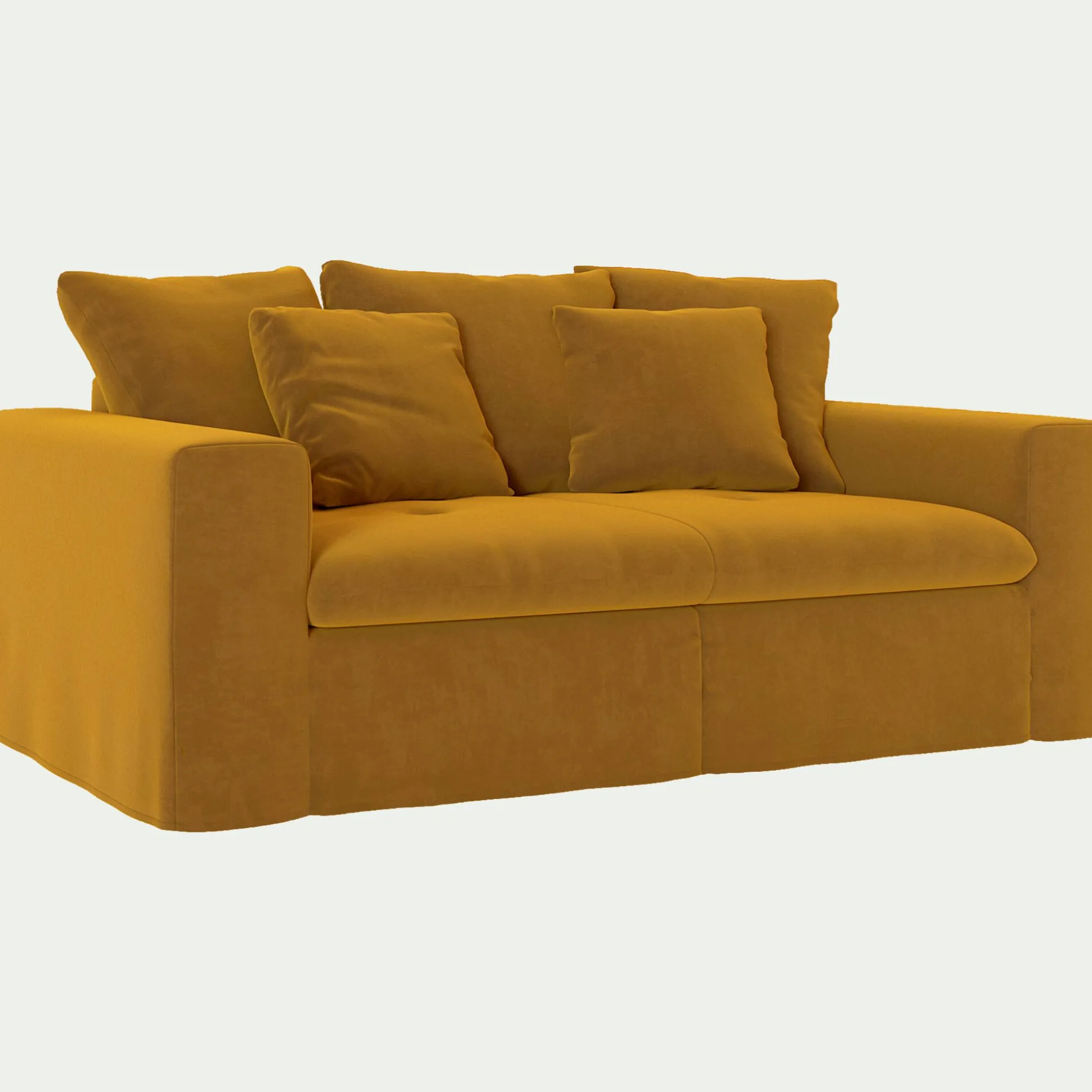 Laissez vous séduire par le charme du canapé Elea, un meuble pensé pour sublimer votre salon. Ce canapé 2 places fixe allie à la fois esthétisme et confort, pour un espace de vie chaleureux. Son dossier à l’accueil plume vous procure une sensation de bien-être douillet alors que sa profonde assise vous donne une impression cocooning d’enveloppement. Ses coussins de dossier, soigneusement jetés, accentuent son aspect accueillant tout en apportant une touche de décoration raffinée. Son surmatelas délicatement intégré confère à l’ensemble une sensation de légèreté fortement appréciable. En ce qui est du design, ses lignes épurées et sa jupe font de lui un atout charme intemporel. Revêtu d’un tissu velours de couleur jaune argan, il vous permet de vous prélasser tout en apportant un côté lumineux et apaisant à votre pièce. Idéal pour la détente ou pour recevoir famille et amis, il incarne à merveille l’équilibre entre sophistication et confort inouï.