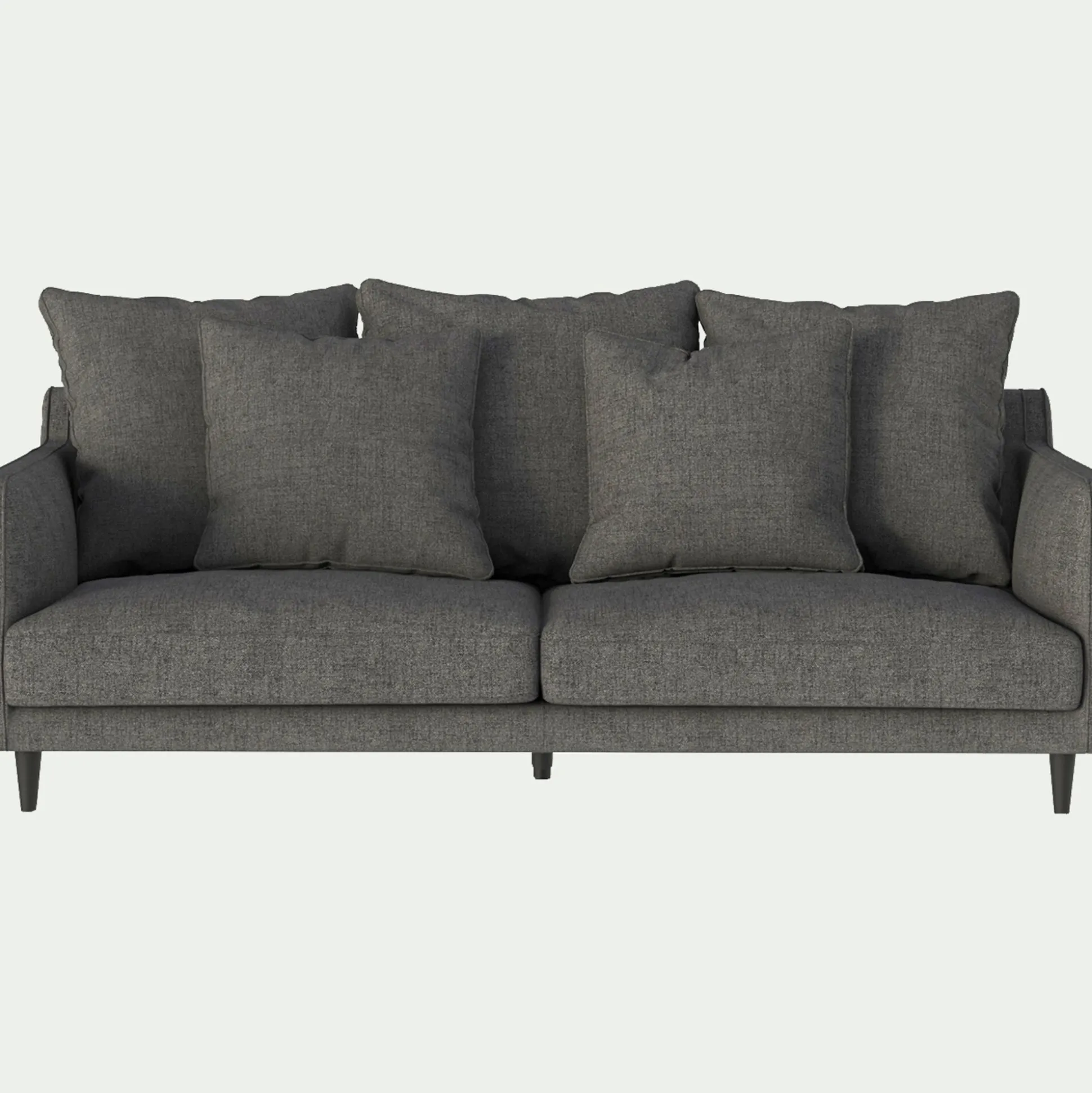 Assise et dossier : Garnissage assise en mousse polyuréthane densité 30kg/m3 et couette en fibre polyester. 3 coussins 60x60cm et 2 coussins 50x50cm garnissage plumes d’oie et fibres polyester.