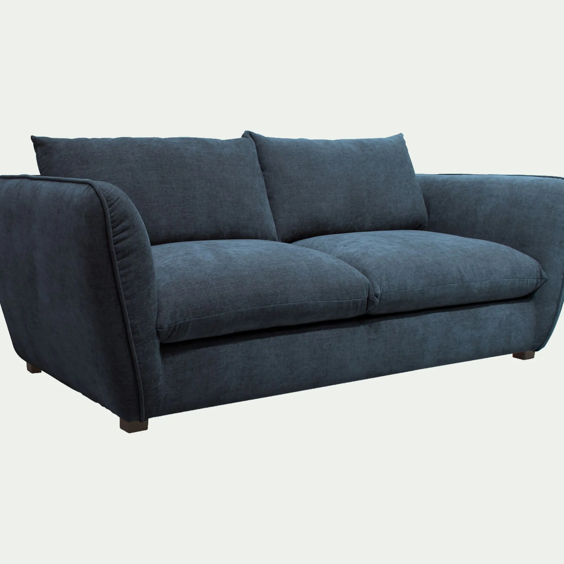 Alliant style et confort, ce canapé droit 3 places séduit par ses formes généreuses et son assise profonde, promesse de détente absolue. Revêtu d’un tissu bleu, il impose une présence joyeuse tout en s’intégrant avec élégance dans la décoration. Son design cossu, sublimé par des coussins moelleux et déhoussables, conjugue esthétique et praticité pour un entretien facilité. Fabriqué en France, ce canapé fixe repose sur une structure en bois massif, gage de solidité et de longévité. Pensé pour offrir un confort optimal, il invite à de longs moments de relaxation, que ce soit pour une pause lecture ou des instants conviviaux. Une pièce de caractère, où chaque détail évoque l’élégance et la détente.