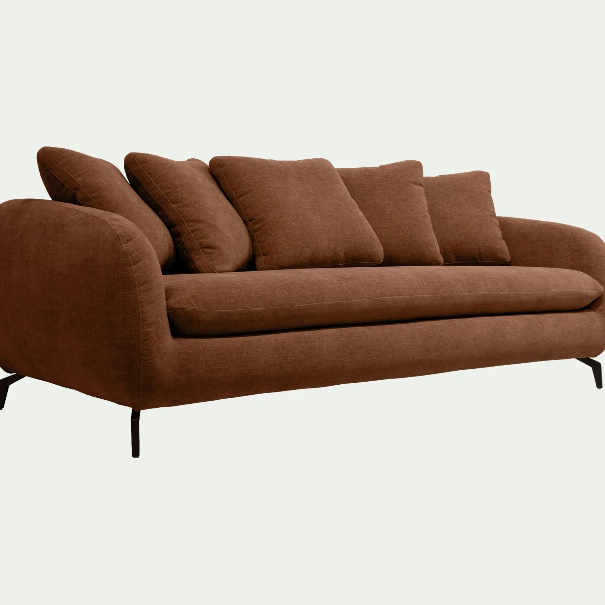 Un joli canapé convertible en tissu pour profiter agréablement de votre salon. Un look contemporain et accueillant, sublimé par un piétement original en acier noir. Vous apprécierez la forme du dossier et des accoudoirs qui vous offrent un maintien optimal de votre dos pour un confort d’assise exceptionnel. Un canapé fabriqué en France, dans des ateliers proches de la ville de Bourges, qui incarne l’excellence du savoir-faire français. Un coloris brun rustrel qui apporte une note citadine et raffinée à votre décoration de salon.