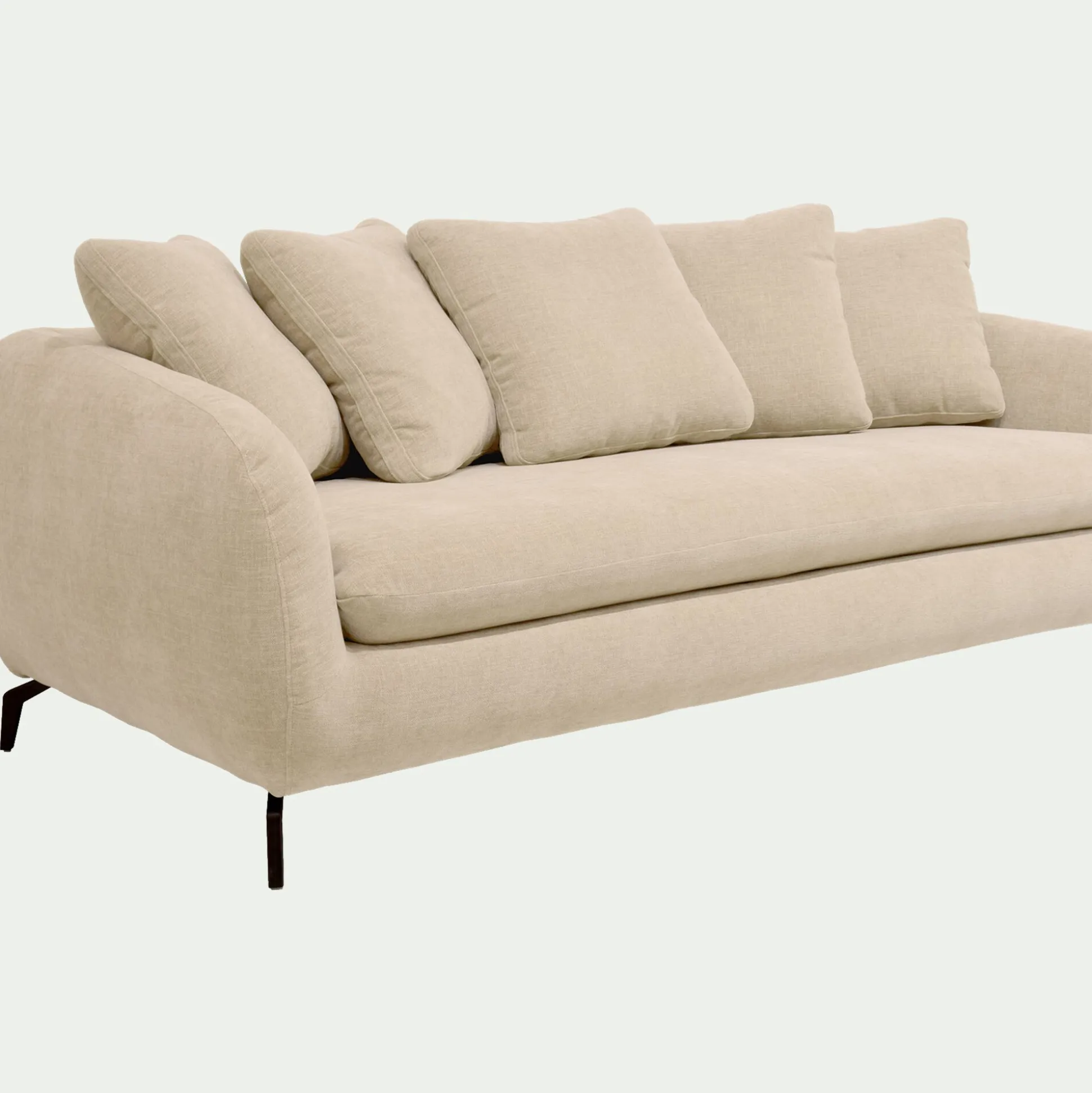 Un joli canapé fixe en tissu pour profiter agréablement de votre salon. Un look contemporain et accueillant, sublimé par un piétement original en acier noir. Vous apprécierez la forme du dossier et des accoudoirs qui vous offrent un maintien optimal de votre dos pour un confort d’assise exceptionnel. Un canapé fabriqué en France, dans des ateliers proches de la ville de Bourge, qui incarne l’excellence du savoir-faire français. Un coloris beige roucas qui apporte une note lumineuse et chaleureuse à votre décoration de salon.