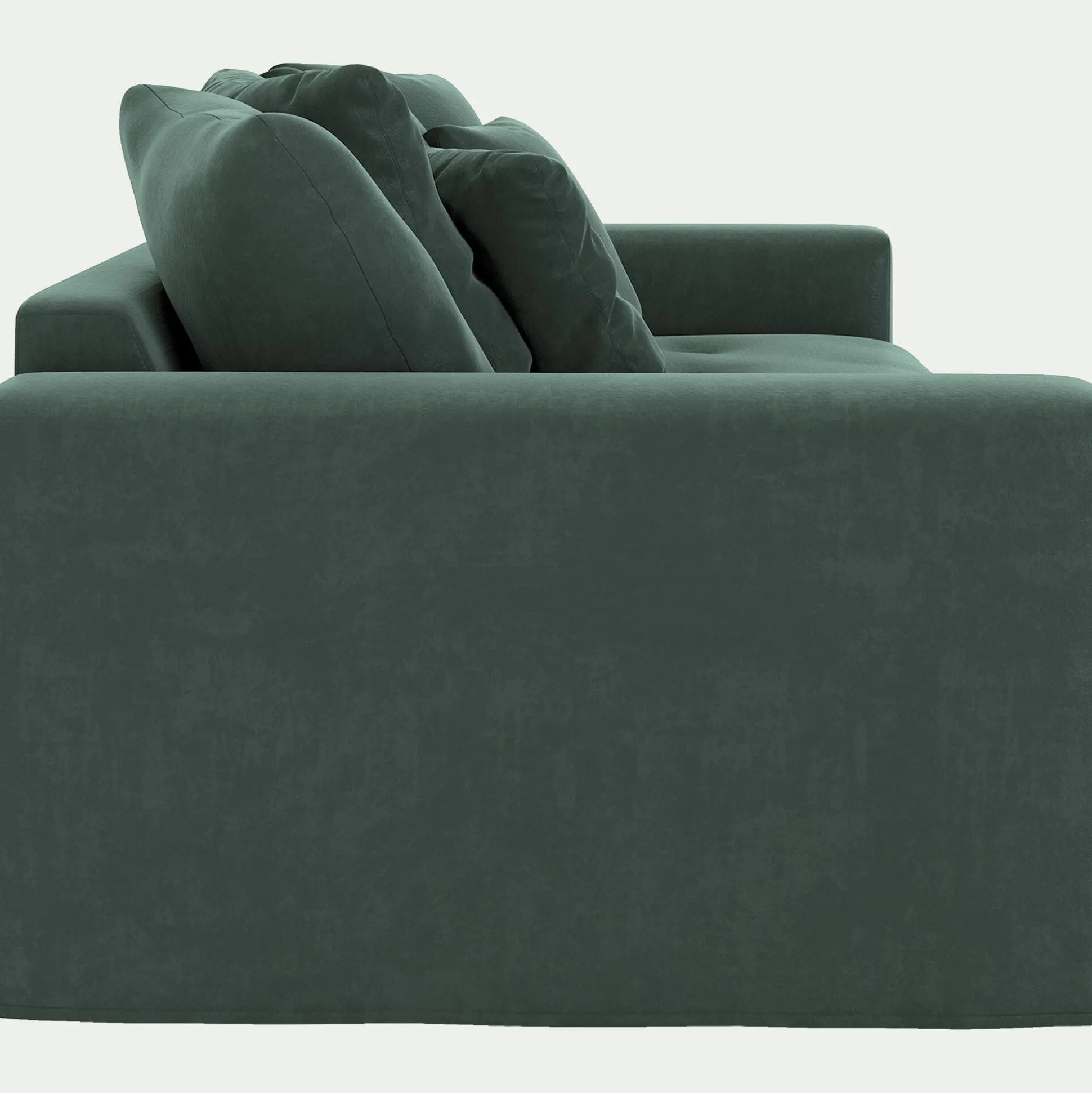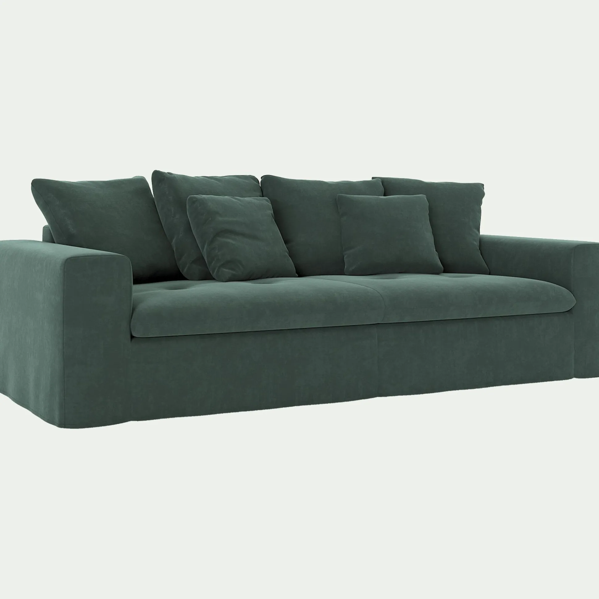 Laissez vous séduire par le charme du canapé Elea, un meuble pensé pour sublimer votre salon. Ce canapé 4 places fixe allie à la fois esthétisme et confort, pour un espace de vie chaleureux. Son dossier à l’accueil plume vous procure une sensation de bien-être douillet alors que sa profonde assise vous donne une impression cocooning d’enveloppement. Ses coussins de dossier, soigneusement jetés, accentuent son aspect accueillant tout en apportant une touche de décoration raffinée. Son surmatelas délicatement intégré confère à l’ensemble une sensation de légèreté fortement appréciable. En ce qui est du design, ses lignes épurées et sa jupe font de lui un atout charme intemporel. Revêtu d’un tissu velours de couleur vert sauge, il vous permet de vous prélasser tout en apportant un côté lumineux et apaisant à votre pièce. Idéal pour la détente ou pour recevoir famille et amis, il incarne à merveille l’équilibre entre sophistication et confort inouï.