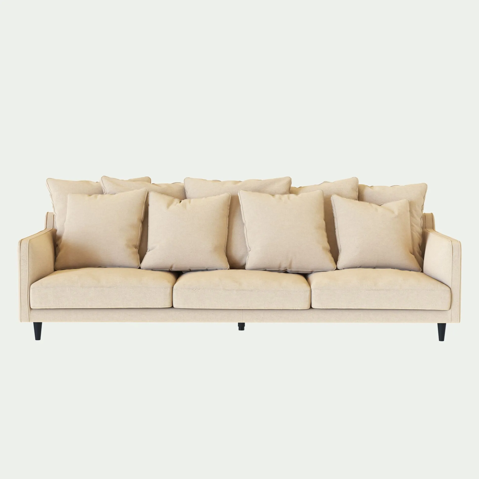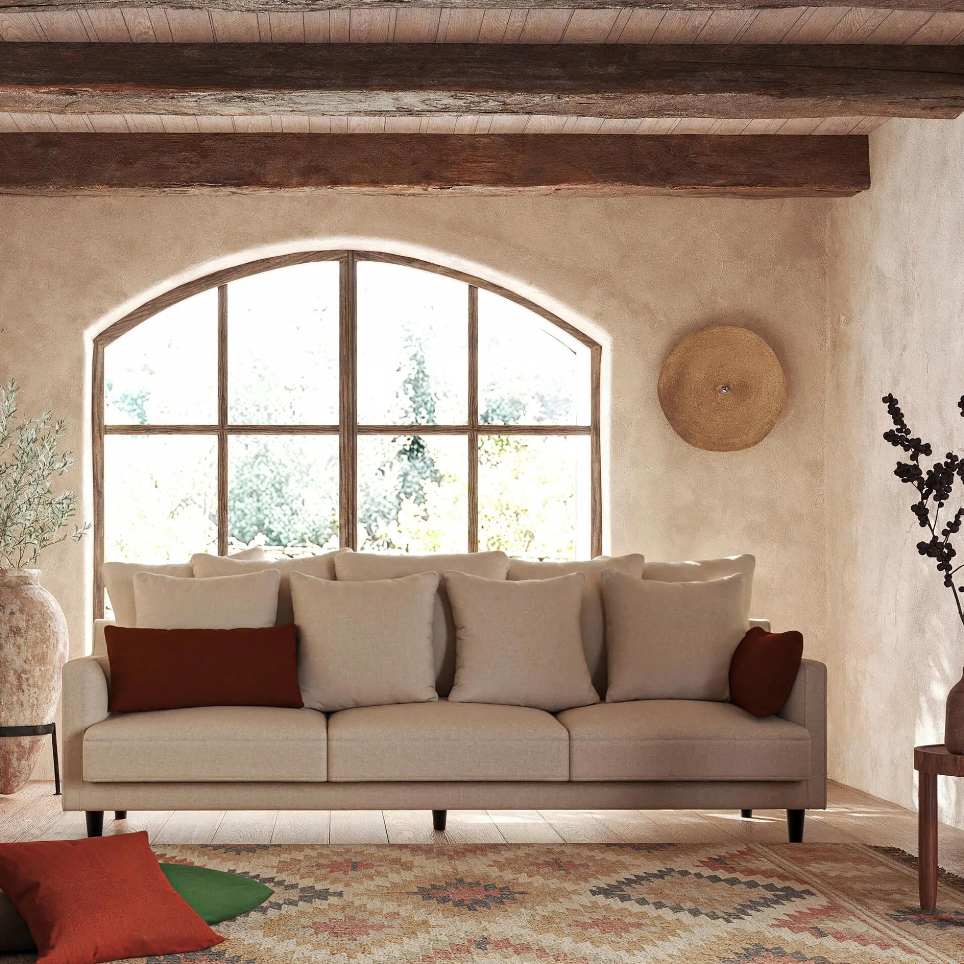 Fabriqué à la main par des passionnés italiens avec une tradition ancestrale dans le domaine du siège et de la tapisserie, ce canapé saura séduire les amateurs de déco. LENITA est une remarquable réinterprétation moderne d’un canapé, inspiré de l’époque somptueuse du Second Empire. Ce canapé fixe de 6 places en tissu joint, avec sa couleur beige roucas, est une façon idéale de décorer son salon d’une pièce raffiné qui vous permettra d’accueillir amis et famille. Installez-vous confortablement dans ce canapé moelleux, garni de plumes d’oies et venez vous détendre pour des moments de pur bien-être. Sa ligne, ses courbes, la préciosité de la matière veloutée inspirent le raffinement. Les multiples coussins repositionnables vous donneront le juste confort à tout moment de la journée. Son assise profonde et généreuse invite à la paresse. Il sera incontestablement la pièce qui vous fera passer de très bons moments cocooning.