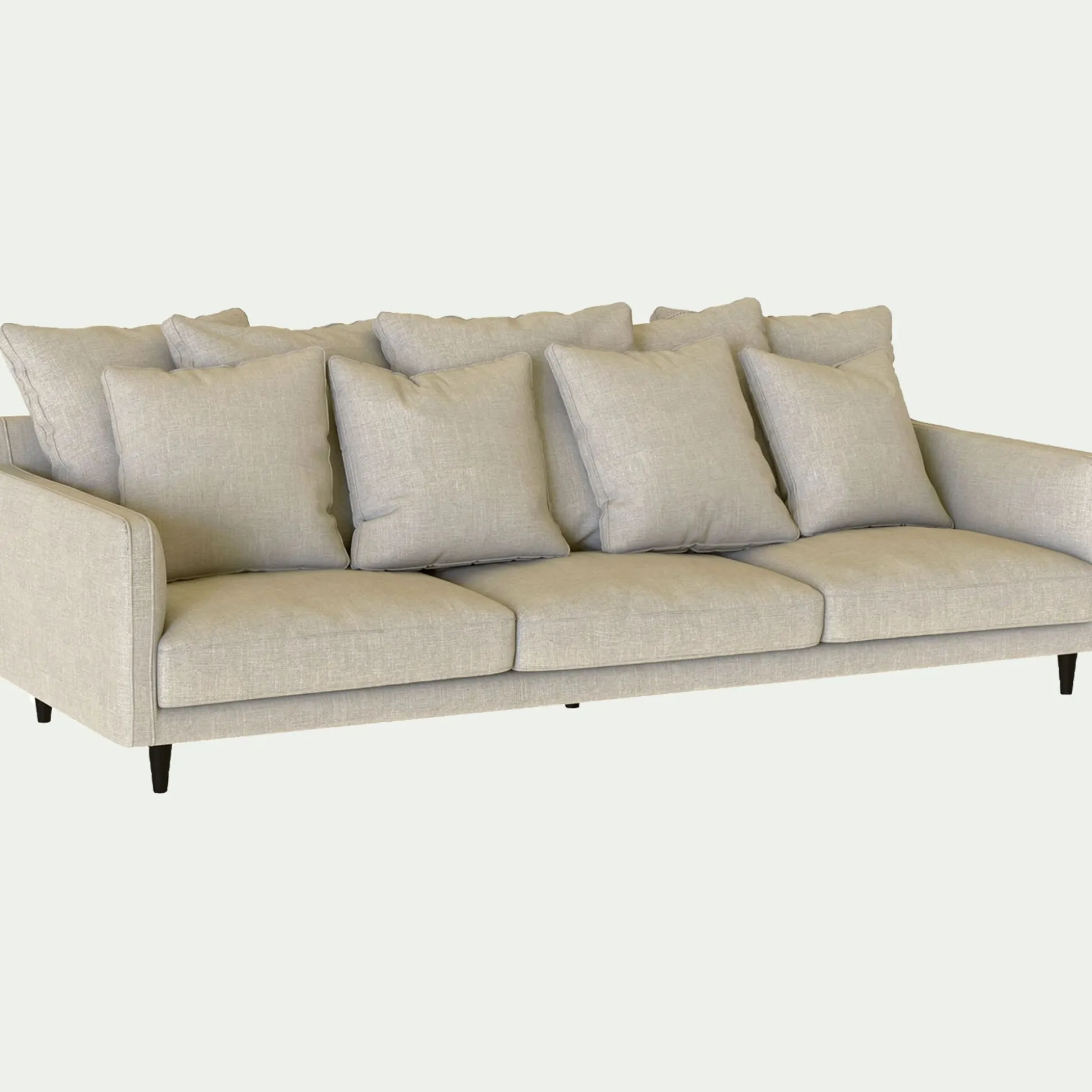 Fabriqué à la main par des passionnés italiens avec une tradition ancestrale dans le domaine du siège et de la tapisserie, ce canapé saura séduire les amateurs de déco. LENITA est une remarquable réinterprétation moderne d’un canapé, inspiré de l’époque somptueuse du Second Empire. Ce canapé fixe de 6 places en tissu mixte, avec sa couleur beige Alpilles, est une façon idéale de décorer son salon d’une pièce raffinée. Installez-vous confortablement dans ce canapé moelleux, garni de plumes d’oies et venez vous détendre pour des moments de pur bien-être. Sa ligne, ses courbes, la préciosité de la matière veloutée inspirent le raffinement. Les multiples coussins repositionnables vous donneront le juste confort à tout moment de la journée. Son assise profonde et généreuse invite à la paresse. Il sera incontestablement la pièce qui vous fera passer de très bons moments cocooning.
