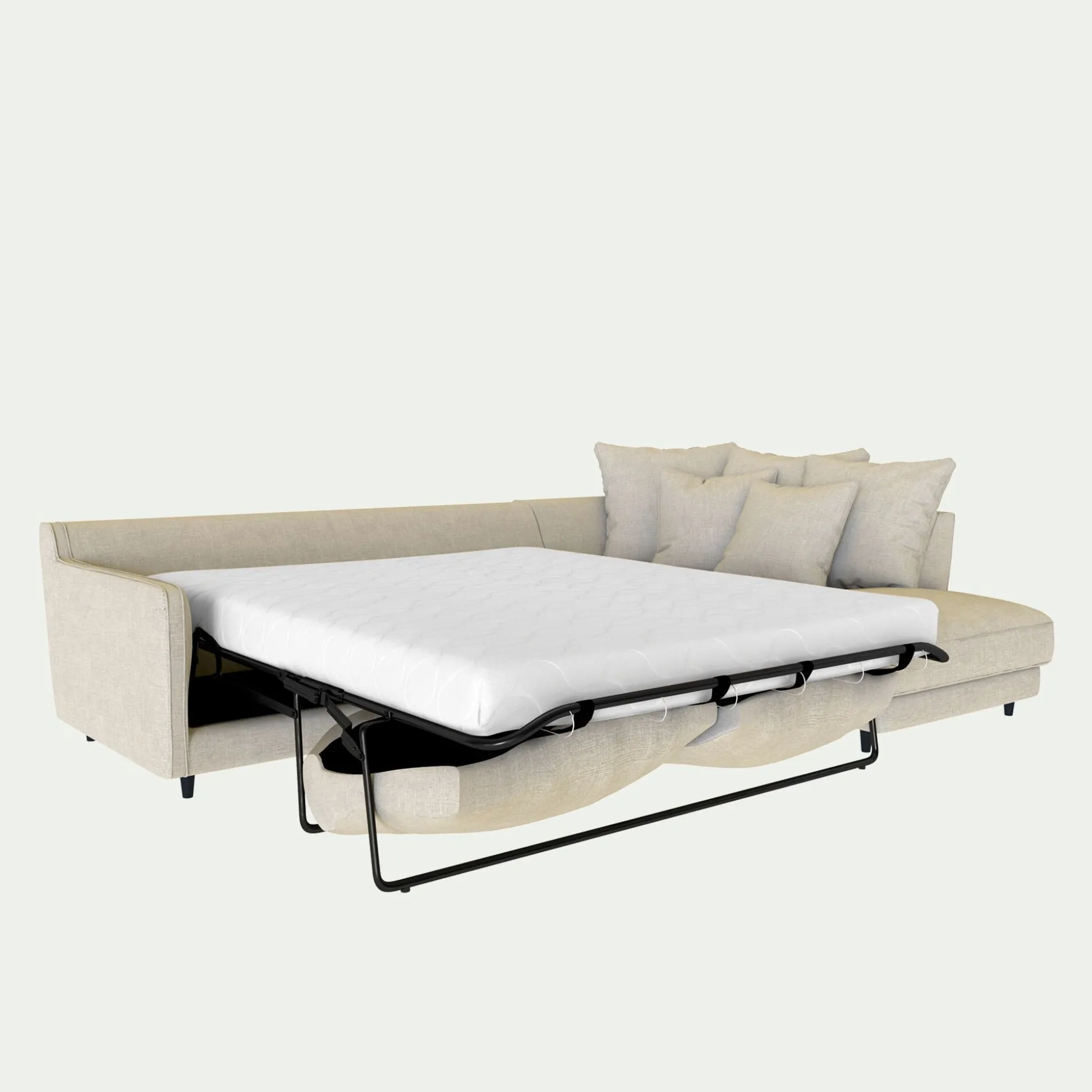 Couchage d’appoint matelas 140×185 cm, canapé convertible ouvert L.293 x P.230 cm.