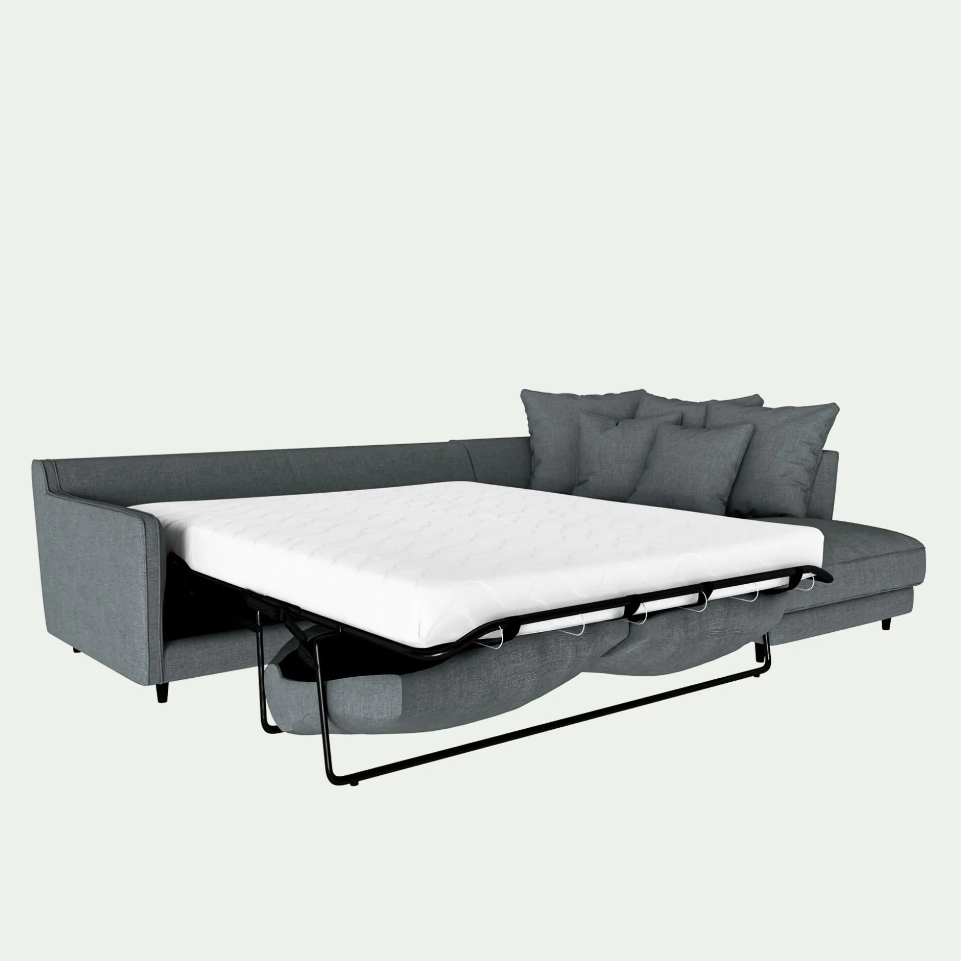 Couchage d’appoint matelas 140×185 cm, canapé convertible ouvert L.293 x P.230 cm.