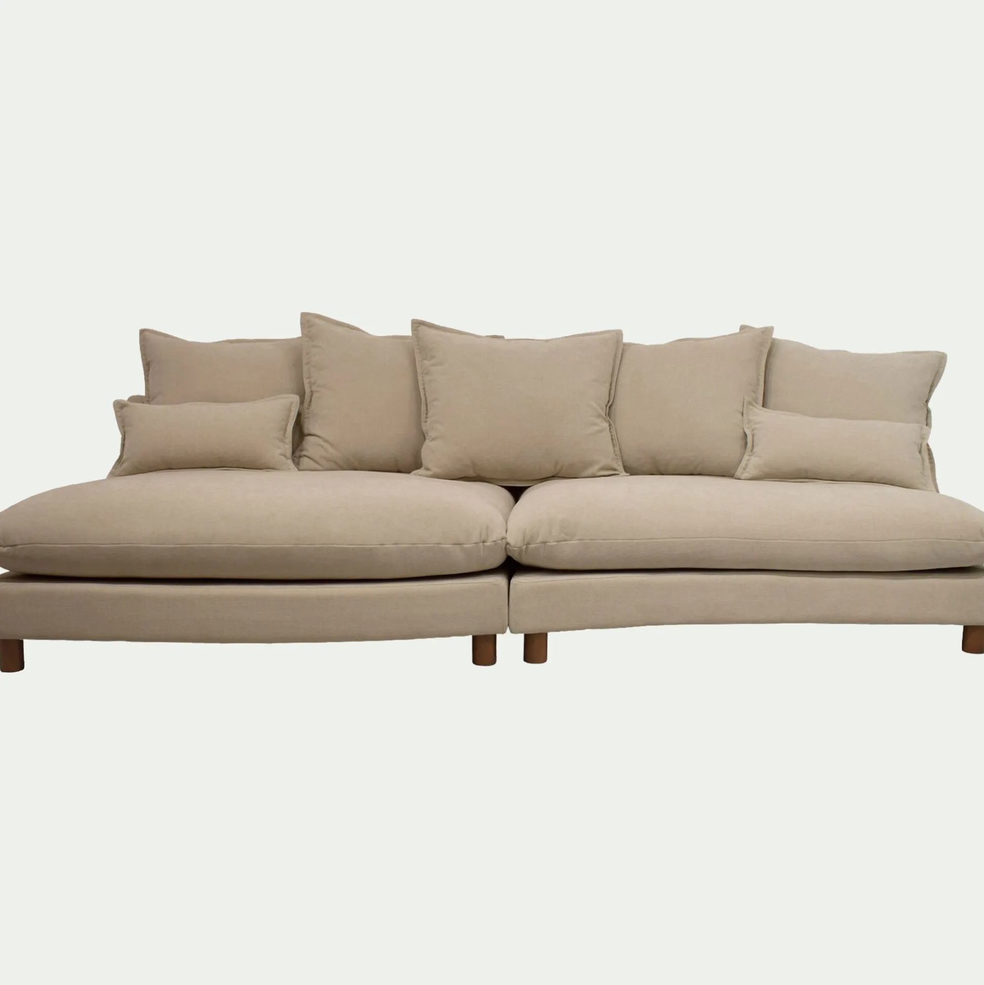Ce grand canapé modulable séduit par ses lignes généreuses et son design singulier, entre modernité et confort. Entièrement convertible, il se compose de deux modules que l’on peut rapprocher pour former un lit d’appoint, idéal pour les moments de détente prolongés. Revêtu d’un tissu beige, il apporte de la lumière, de la douceur et ainsi participe à une atmosphère apaisante. Ses nombreux coussins renforcent l’esprit cocooning et invitent à s’y lover. Fabriqué en France, dans des ateliers situés près de Bourges, ce canapé reflète le savoir-faire d’artisans passionnés. Une pièce de caractère, conçue avec soin, qui incarne l’élégance à la française.