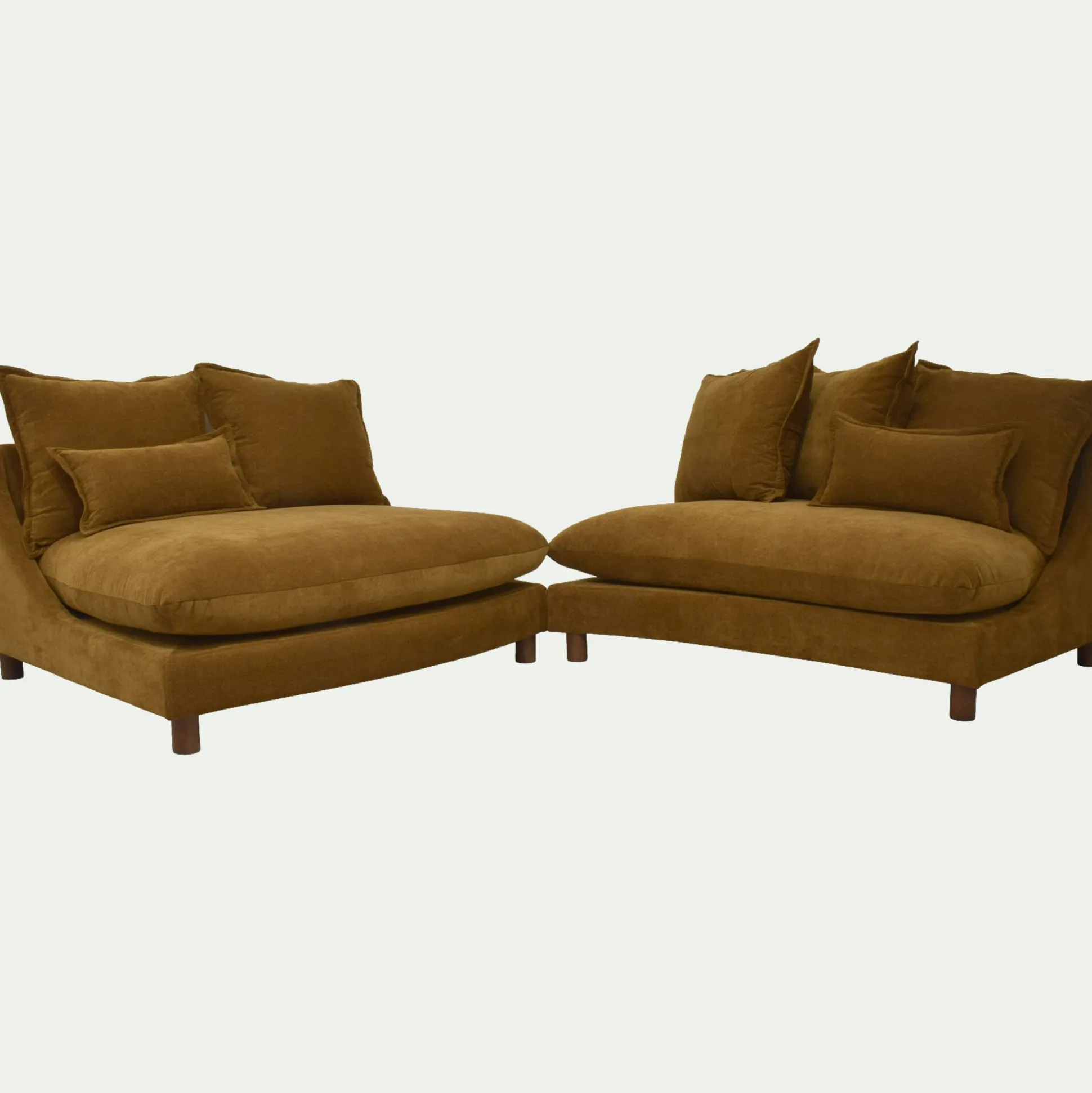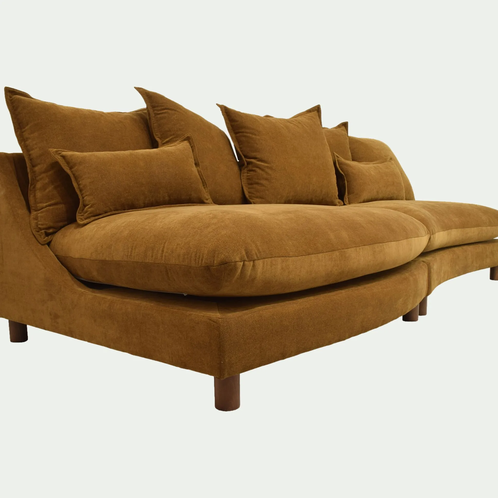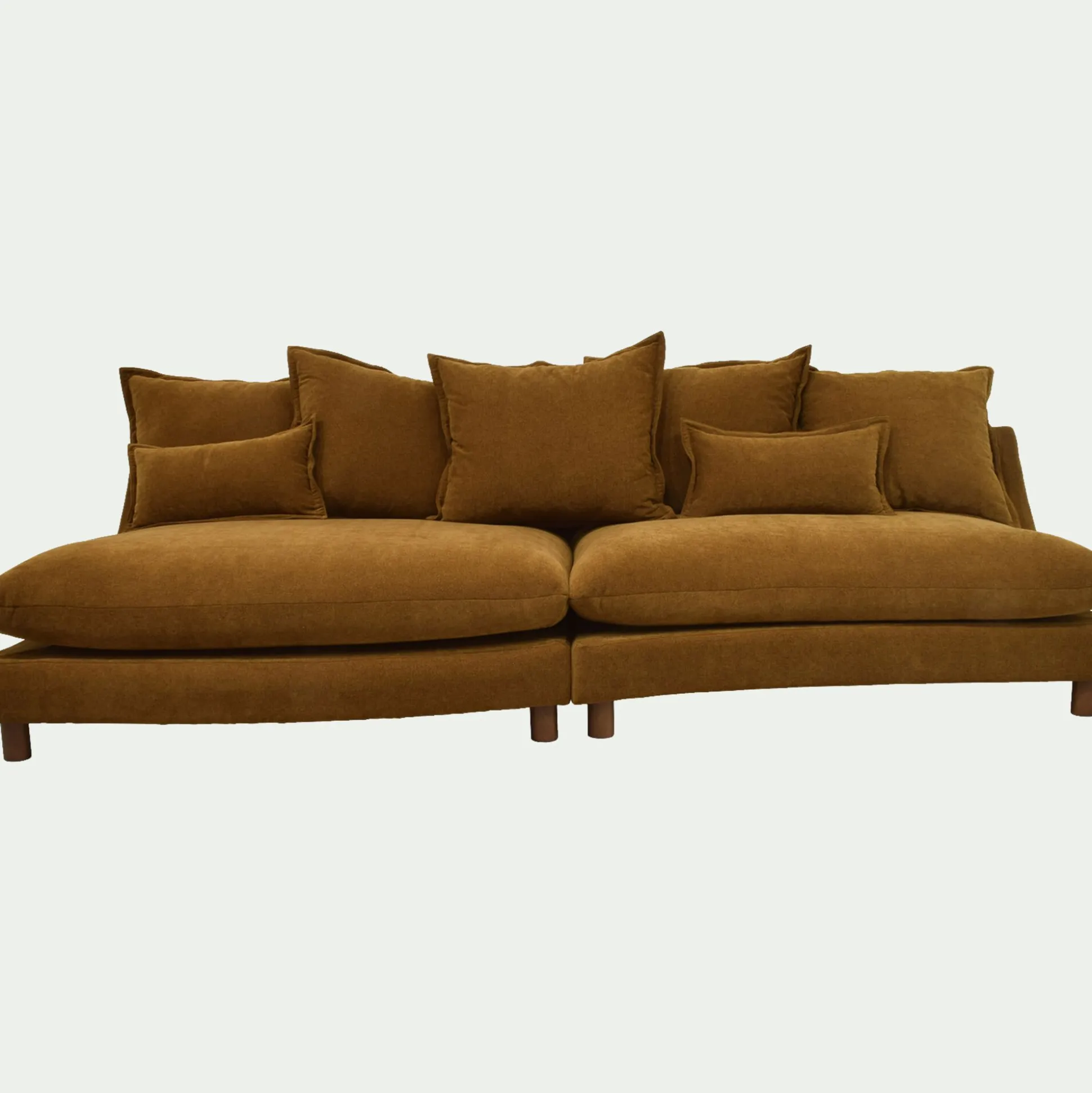 Ce grand canapé modulable séduit par ses lignes généreuses et son design singulier, entre modernité et confort. Entièrement convertible, il se compose de deux modules que l’on peut rapprocher pour former un couchage d’appoint, idéal pour les moments de détente prolongés. Revêtu d’un tissu bronze, il apporte une touche chaleureuse et précieuse à l’espace. Ses nombreux coussins renforcent l’esprit cocooning et invitent à s’y lover. Fabriqué en France, dans des ateliers situés près de Bourges, ce canapé reflète le savoir-faire d’artisans passionnés. Une pièce de caractère, conçue avec soin, qui incarne l’élégance à la française.