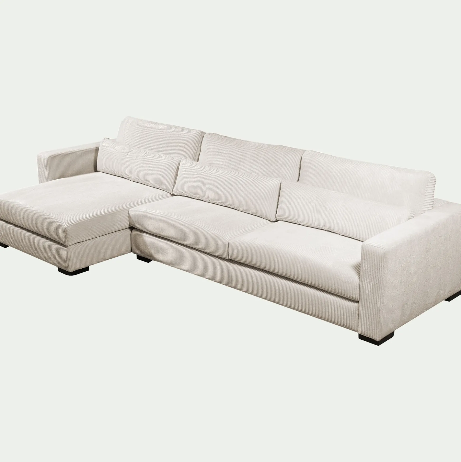 Spacieux et raffiné, le canapé d’angle Batis avec angle à gauche transforme le salon en un espace convivial et confortable. Sa chaise longue offre un espace idéal pour s’allonger et savourer un véritable instant de repos. En velours côtelé, il insuffle un vent de douceur et d’élégance dans le salon. Son coloris beige illumine la pièce et crée un espace où le bien-être règne. Conçu pour durer, ce canapé fixe repose sur une structure en bois massif, garantissant solidité et stabilité. Il s’impose comme l’élément central du séjour, invitant au partage et à la relaxation.